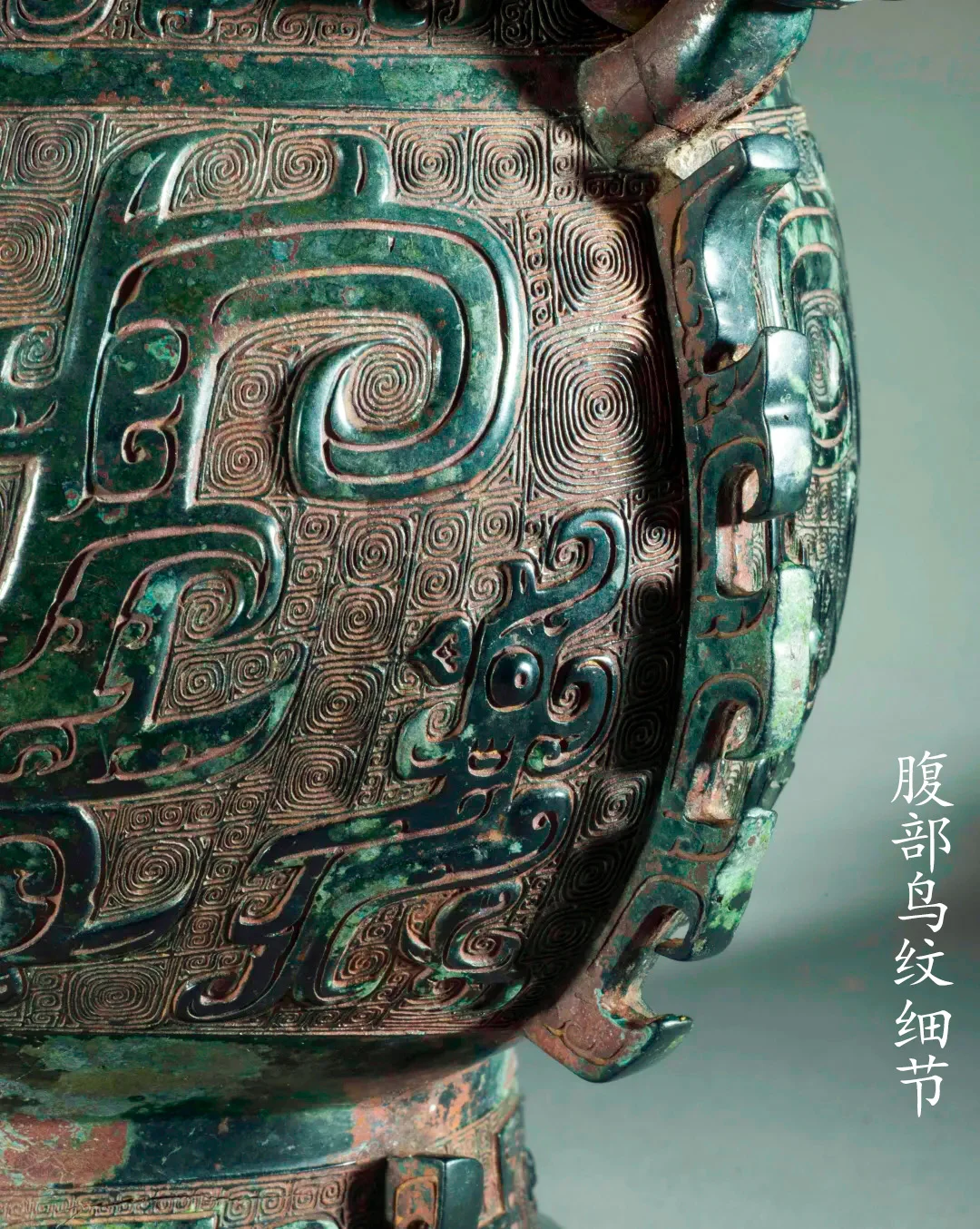 肩部饰一周四组八只夔纹,前后各二组间以扉棱为界,两组夔纹两两相对。腹部前后各饰一组大饕餮纹,间以扉棱为鼻,半面饕餮纹(夔纹)其身后各饰一只鸟纹。圈足饰一周四组八只蛇纹, 前后各二组间以扉棱为界,两组蛇纹两两相对。整器以云雷纹衬地。