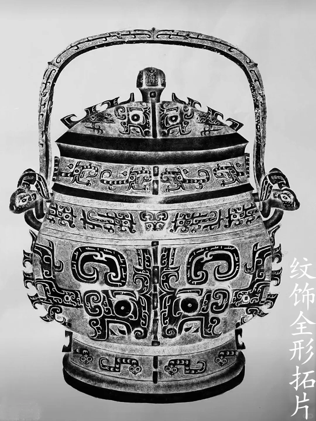带盖,盔形盖,有提梁,直口,口沿下折束腰,短颈,颈两侧有半环纽套装接兽首弓形扁提梁,圆鼓腹,高圈足。
