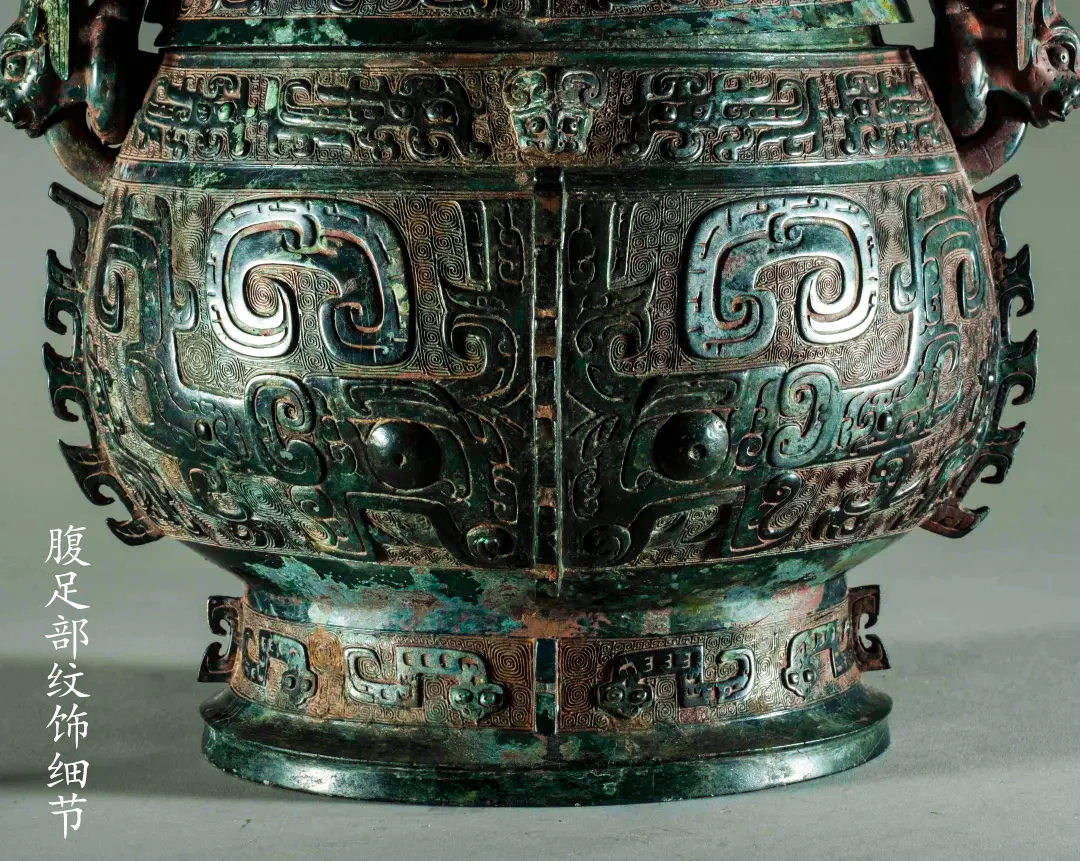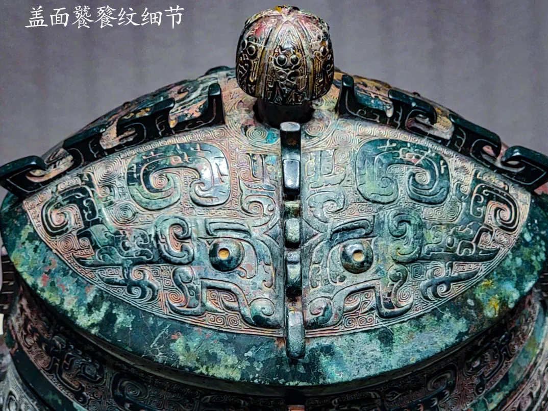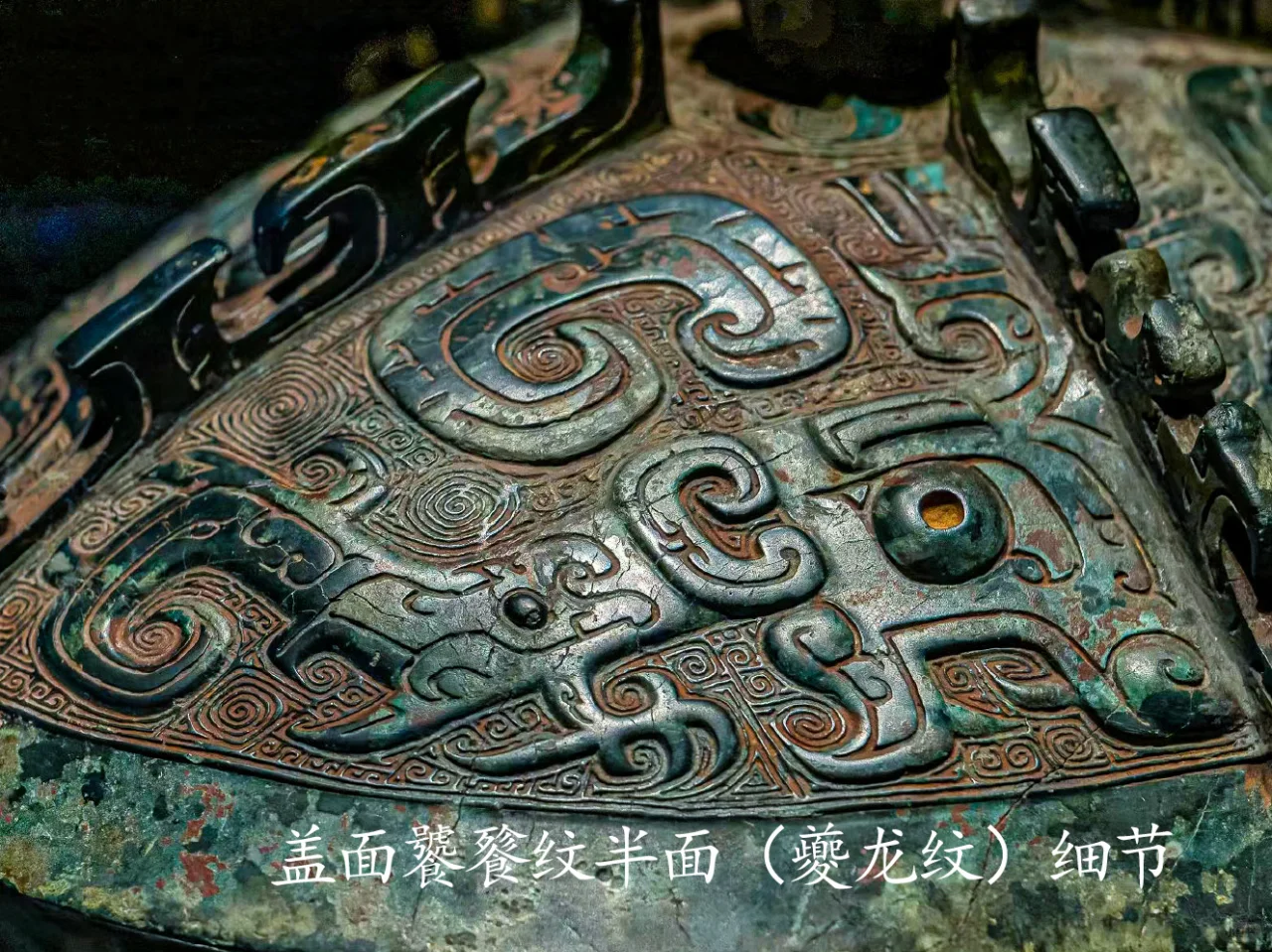自口至足有四道扉棱,盖面顶部置花蕾六瓣状,每瓣饰蝉纹,盖面前后各饰一组饕餮纹,渐以扉棱为鼻。盖边缘饰一周四组八只象鼻夔纹,前后各二组间以扉棱为界,两组象鼻夔纹两两相对。