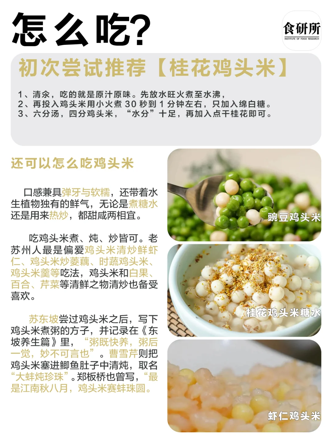 [老虎R]吃鸡头米煮、炖、炒皆可。老苏州人最是偏爱鸡头米清炒鲜虾仁、鸡头米炒菱藕、时蔬鸡头米、鸡头米羹等吃法,鸡头米和白果、百合、芹菜等清鲜之物清炒也备受喜欢。