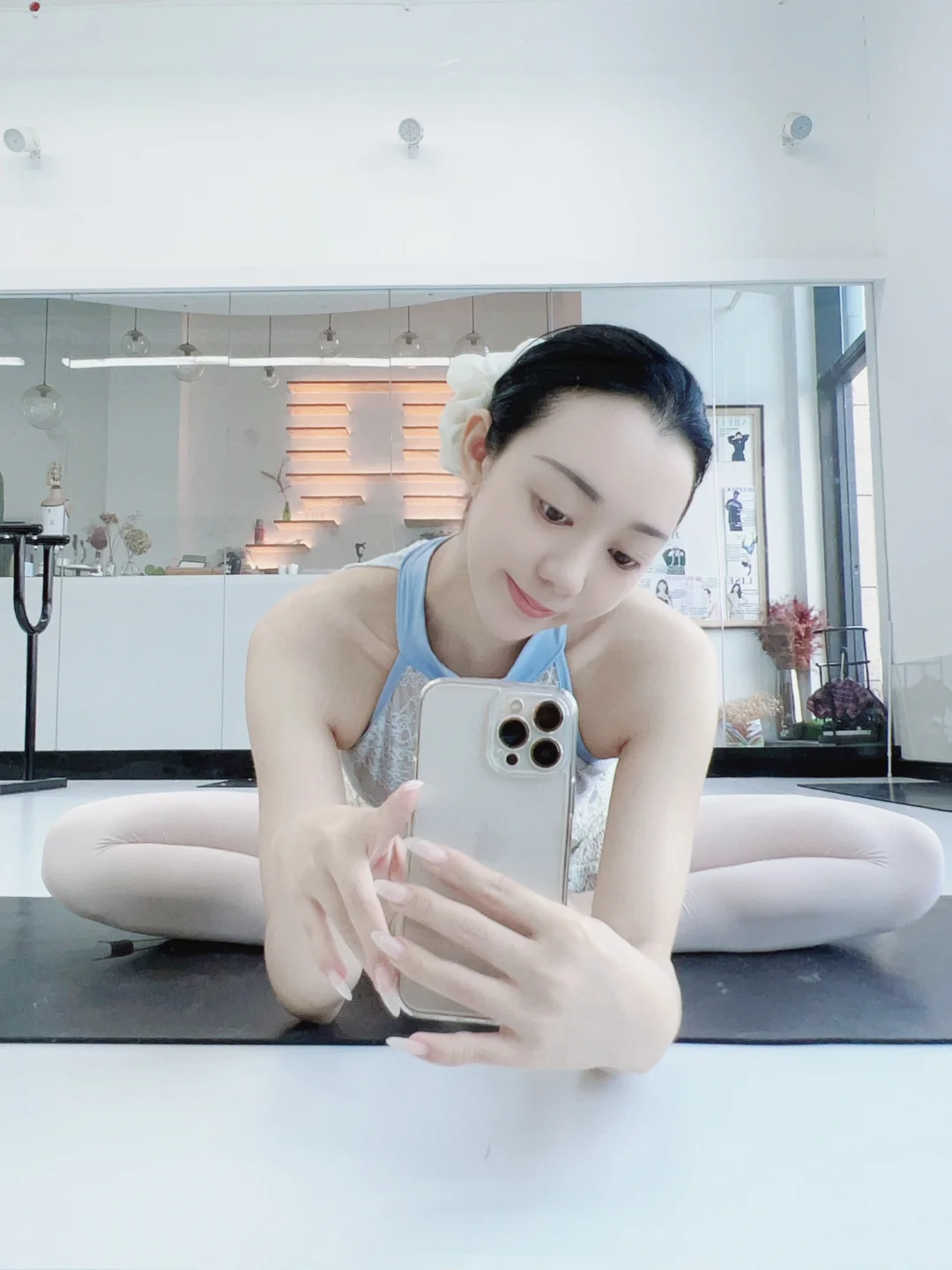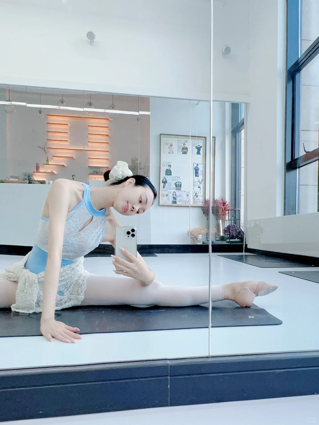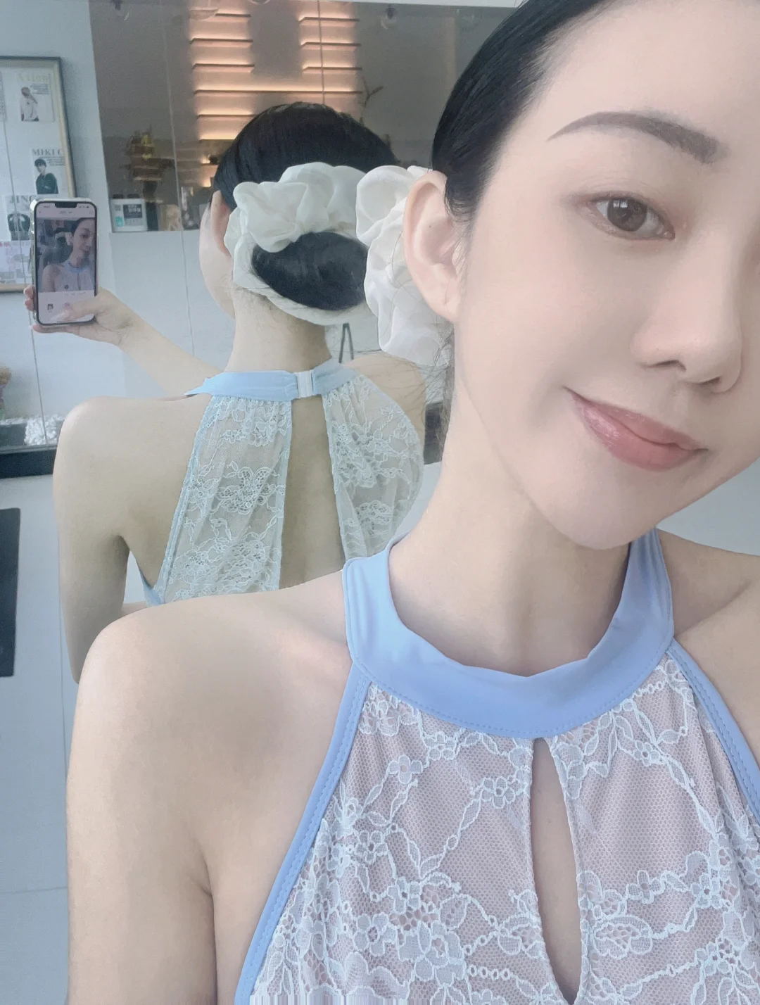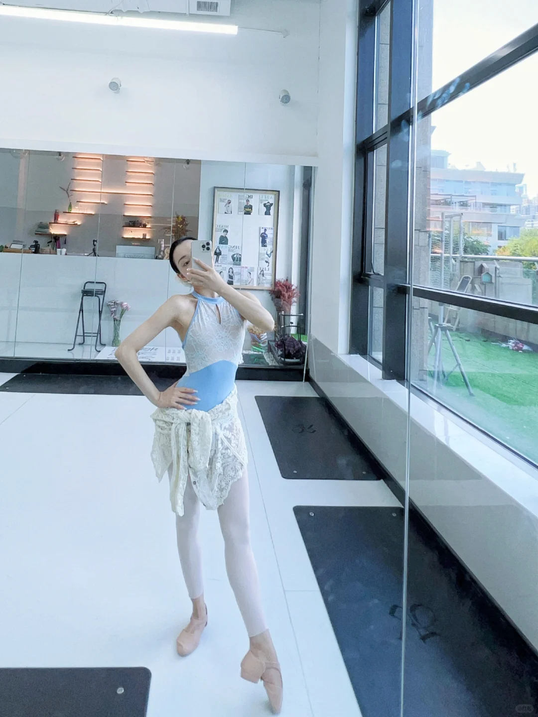天空蓝➕白云白的一件蕾丝拼接插肩款芭蕾体服🌐
