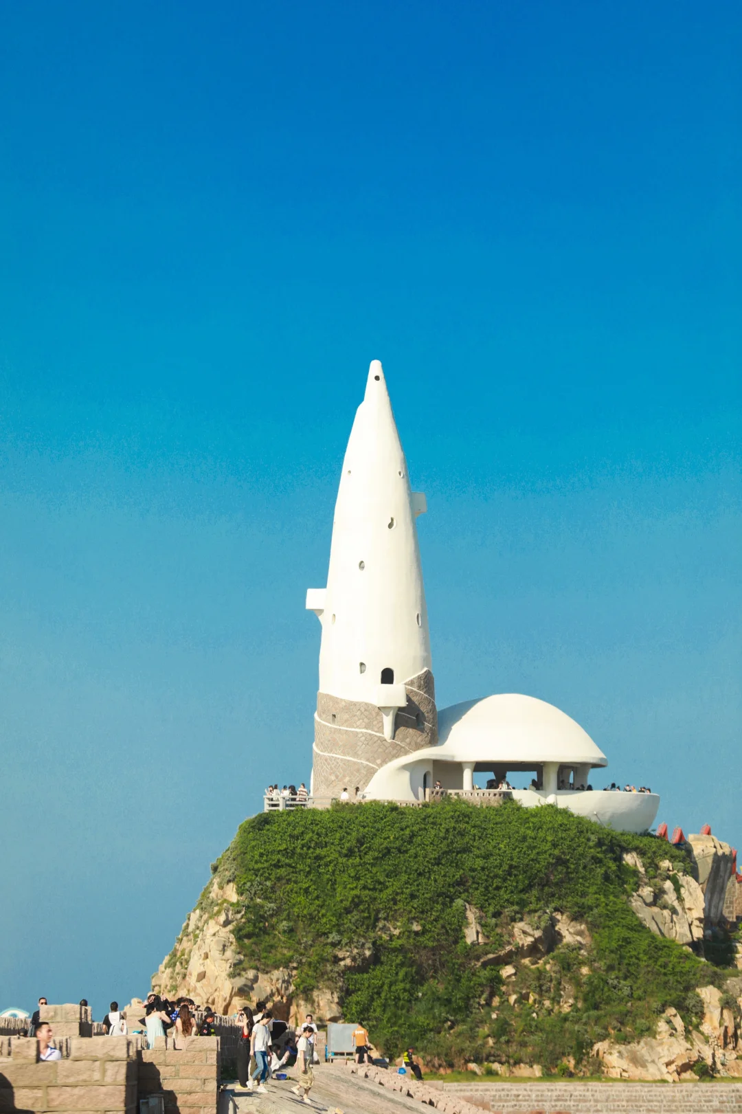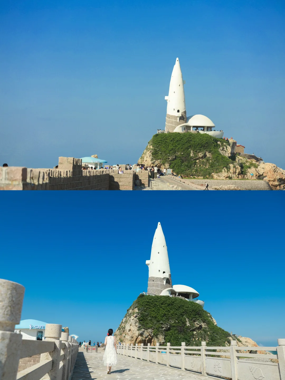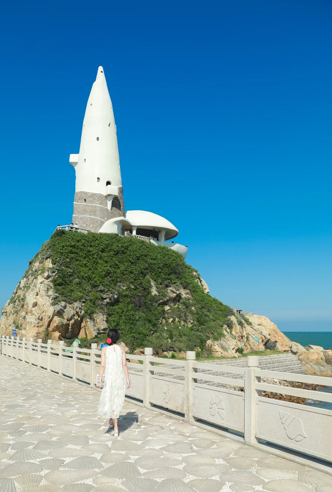 站在海螺塔上看海是真的美 然而在塔下与海螺塔合照才更加绝! 📷避开人流拍照攻略:一定要走到长廊两侧外的斜坡上拍,以海螺塔为背景,可以很好的避开人群,我的照片都是在右侧拍的,左边的石阶上也有很不错的机位 ☑️交通 🚗自驾导航福州长乐下沙海滨度假村,有收费停车场 🚇6号线万寿站下后乘坐645路公交专线到终点站下沙站 ⚠️出行Tips :一定要选个大晴天来,周末人多尽量避开。