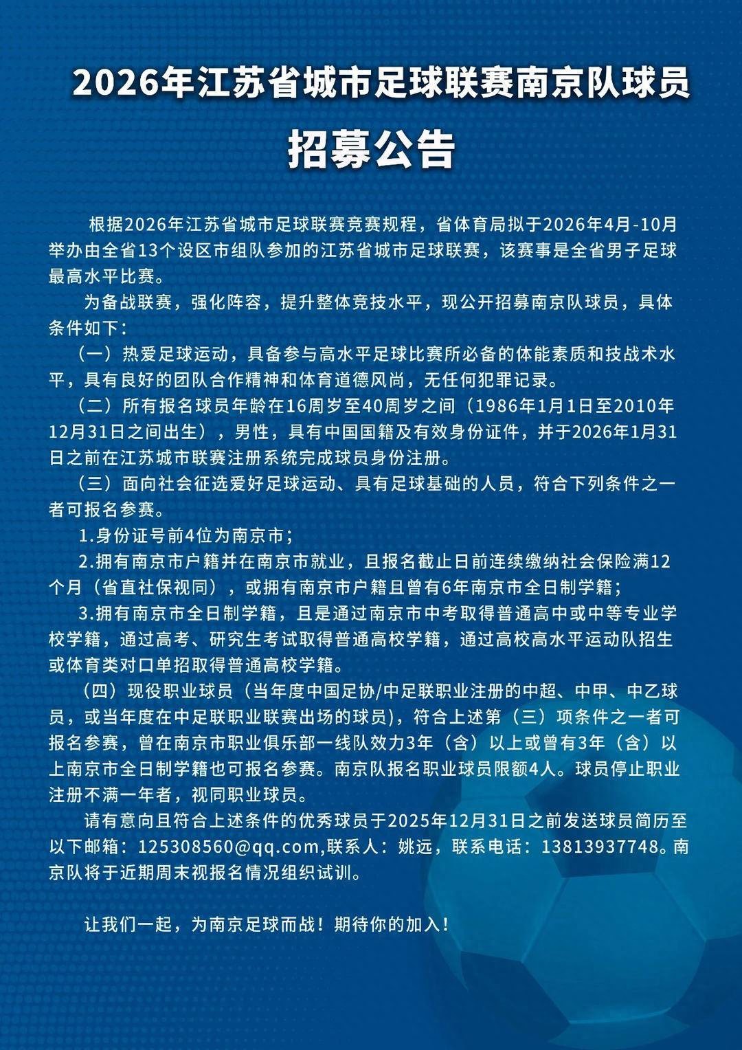 12月8日夜间,南京市足协正式发布了2026年江苏省城市足球联赛南京队的招募公告。其中,需要符合哪些条件才能报名成功呢,让我们来一探究竟。