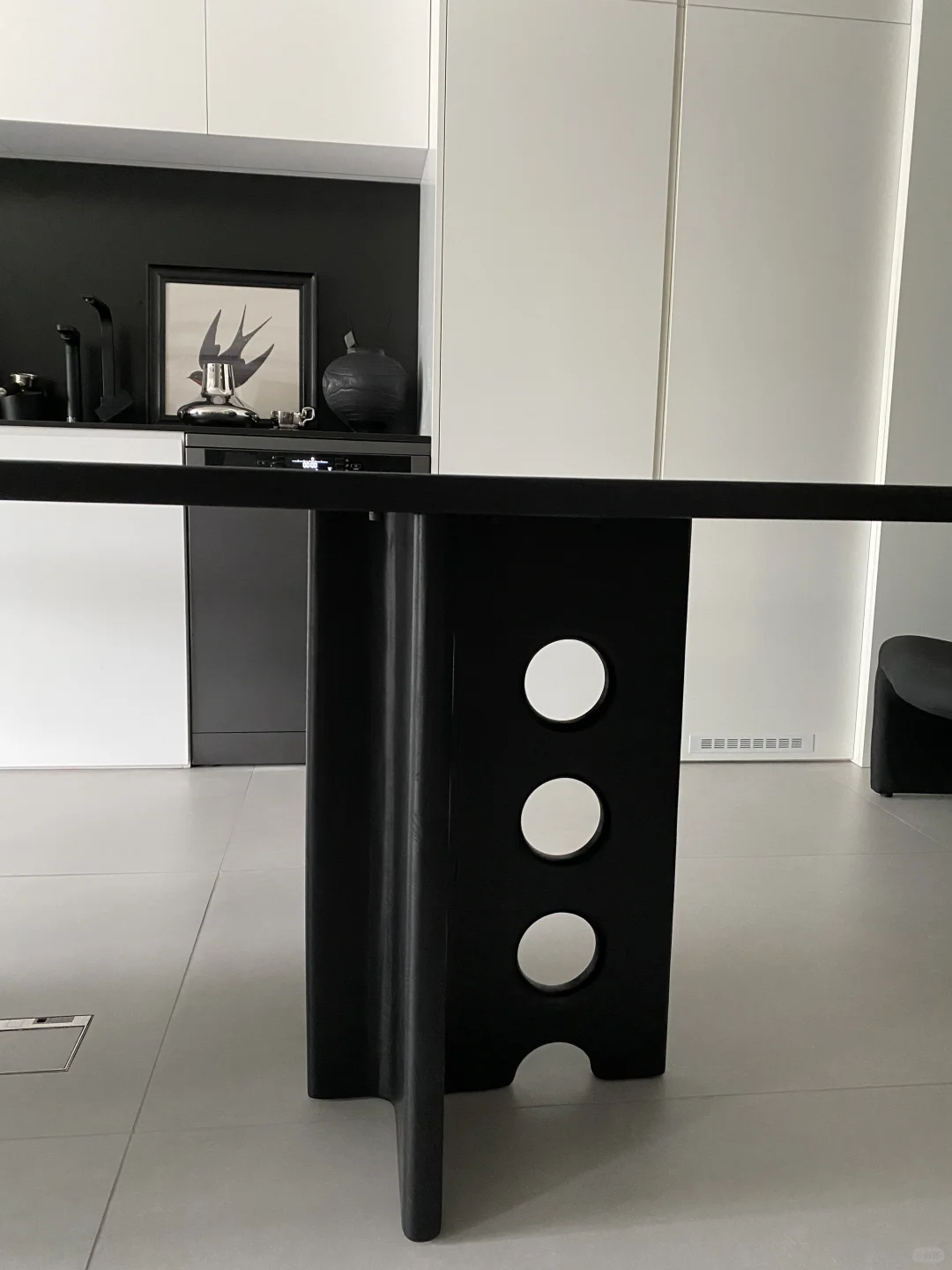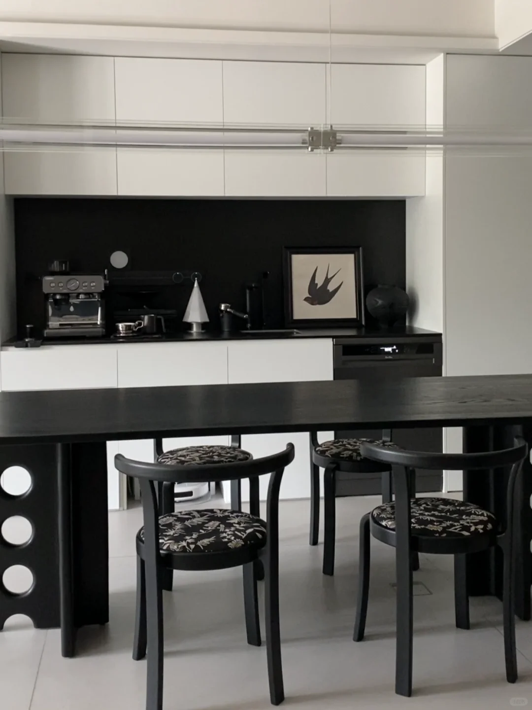哎哟,这黑色餐桌椅,真是"低调的奢华"啊,坐上去是不是能自动瘦腿健身呢?