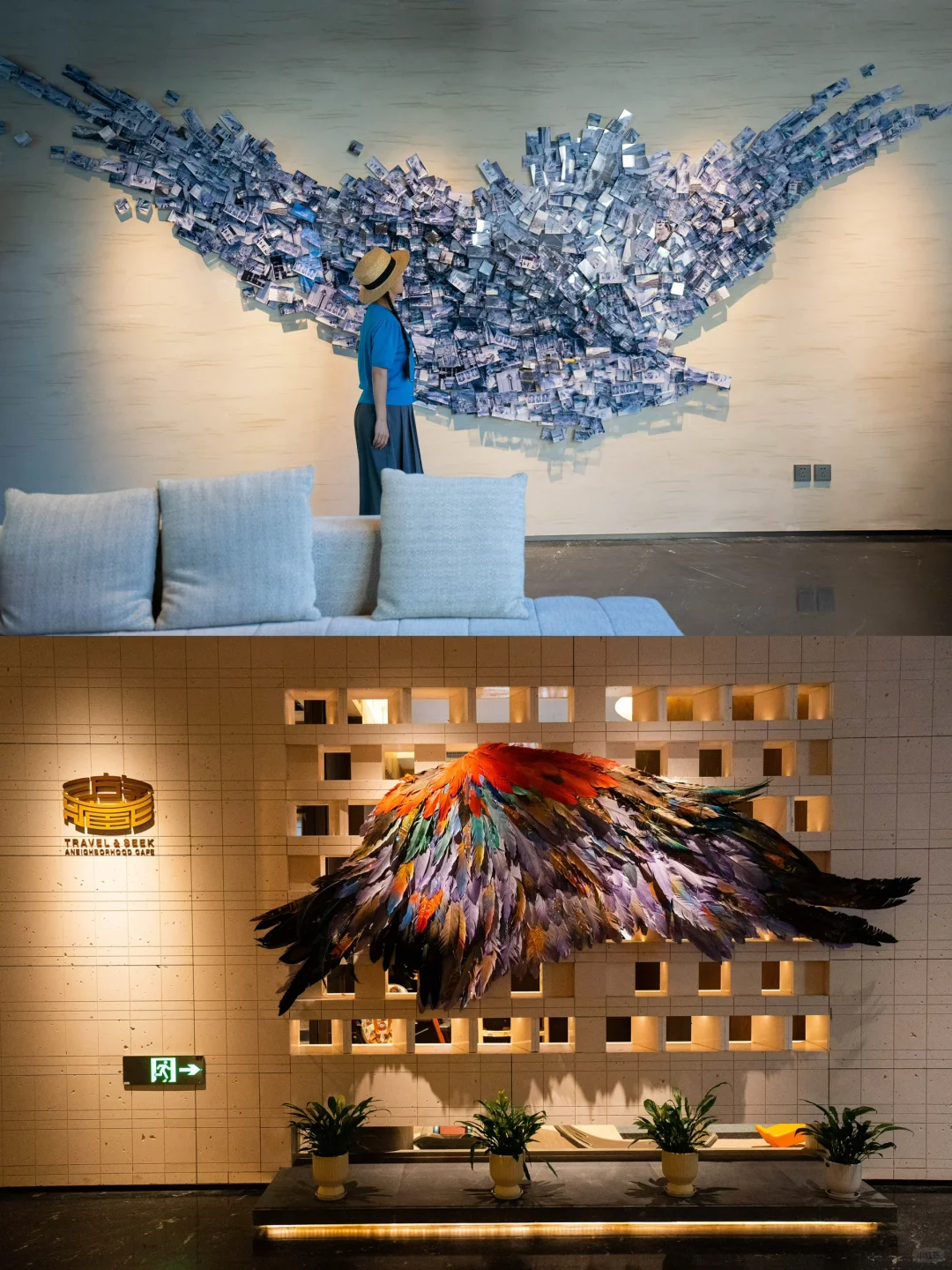 酒店一共有两栋,我们定的双床房在2号楼,管家会将我们的行李送至房间。沿途我们看到以“神鹰栖息之地”为设计灵感,在陈列上尽显神鹰元素。