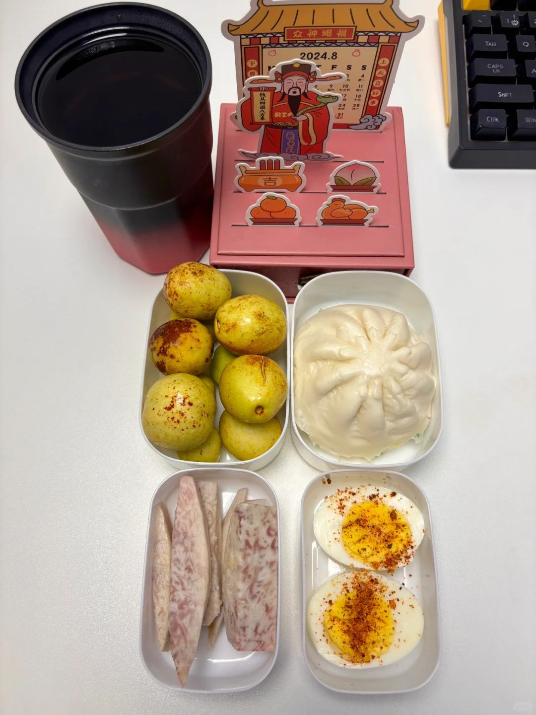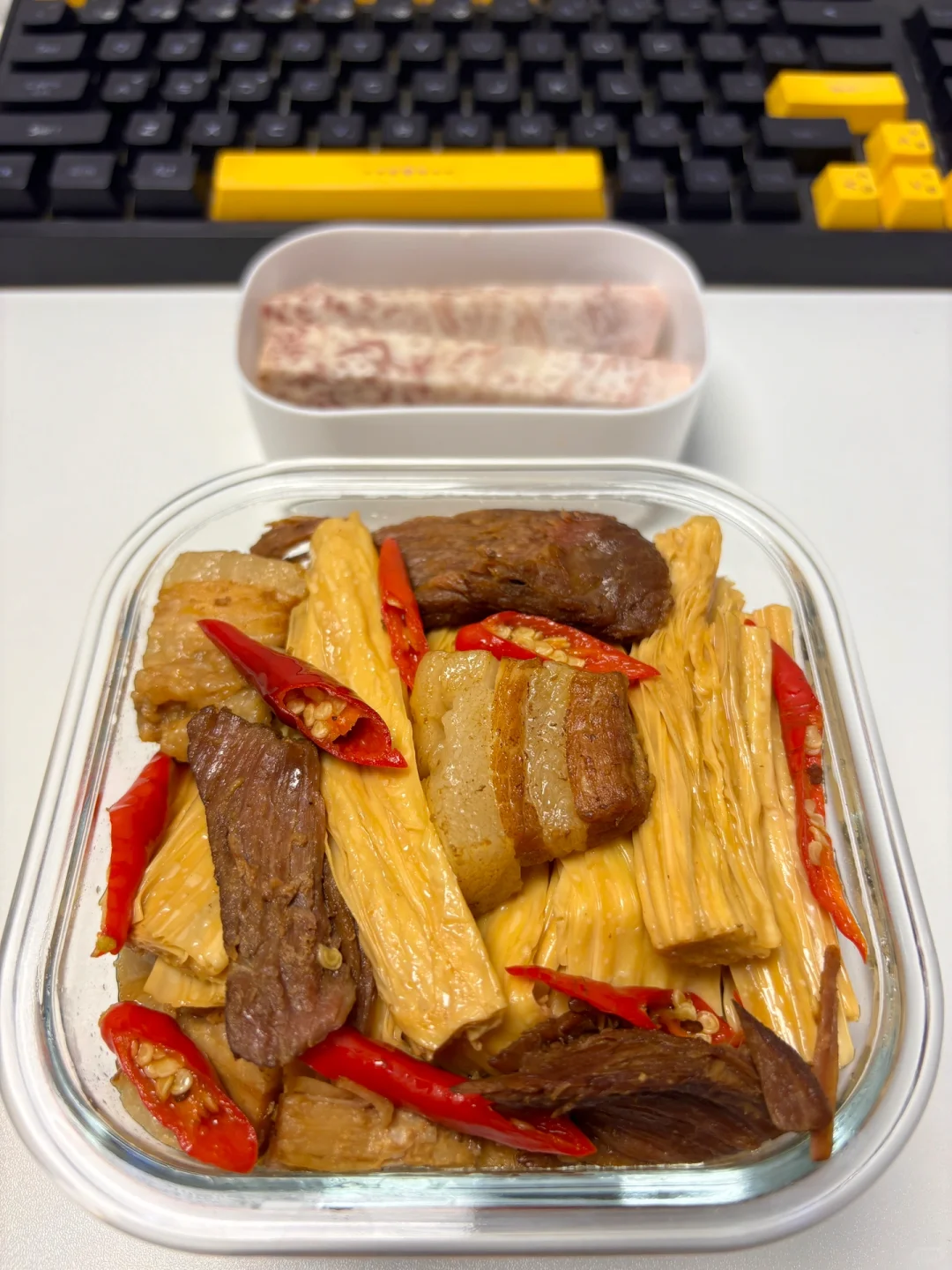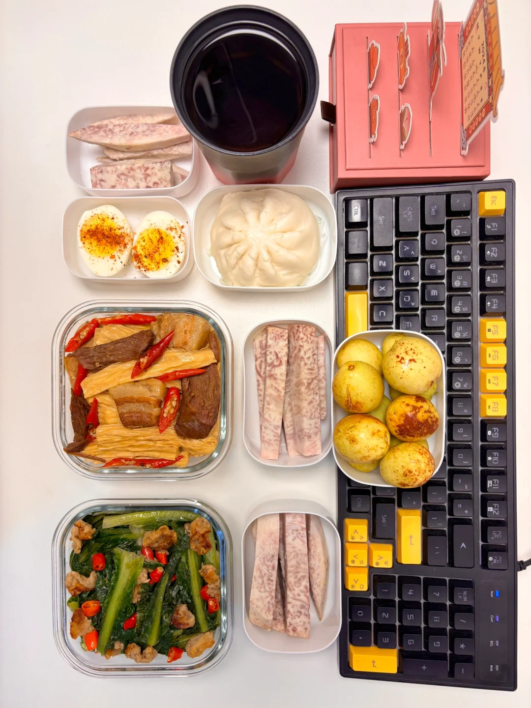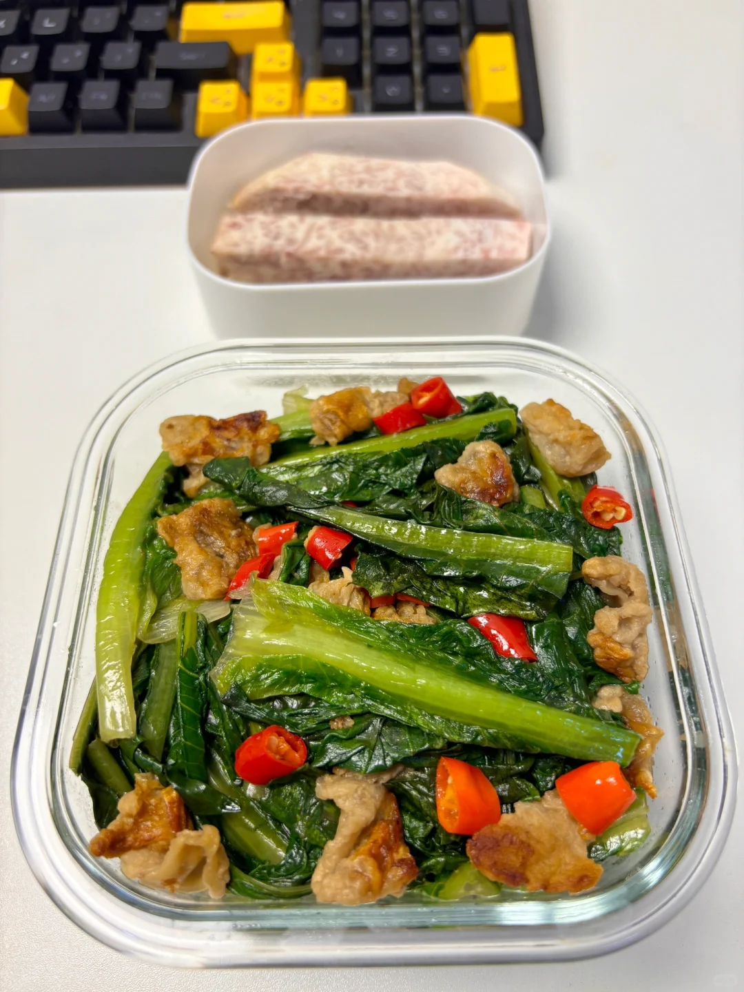 1⃣️早:包子、芋头、鸡蛋、黑茶(1.8💰) 2⃣️中:腐竹烧肉、芋头(4.4💰) 3⃣️晚:油麦菜炒油渣、芋头(2.6💰) 4️⃣水果:枣(同事给滴0💰) 猪肉菜市场买的约2💰猪油渣自己熬的约0.5💰 合计:8.8💰