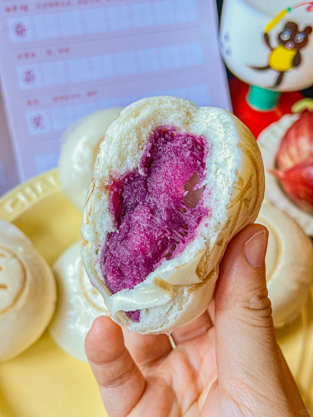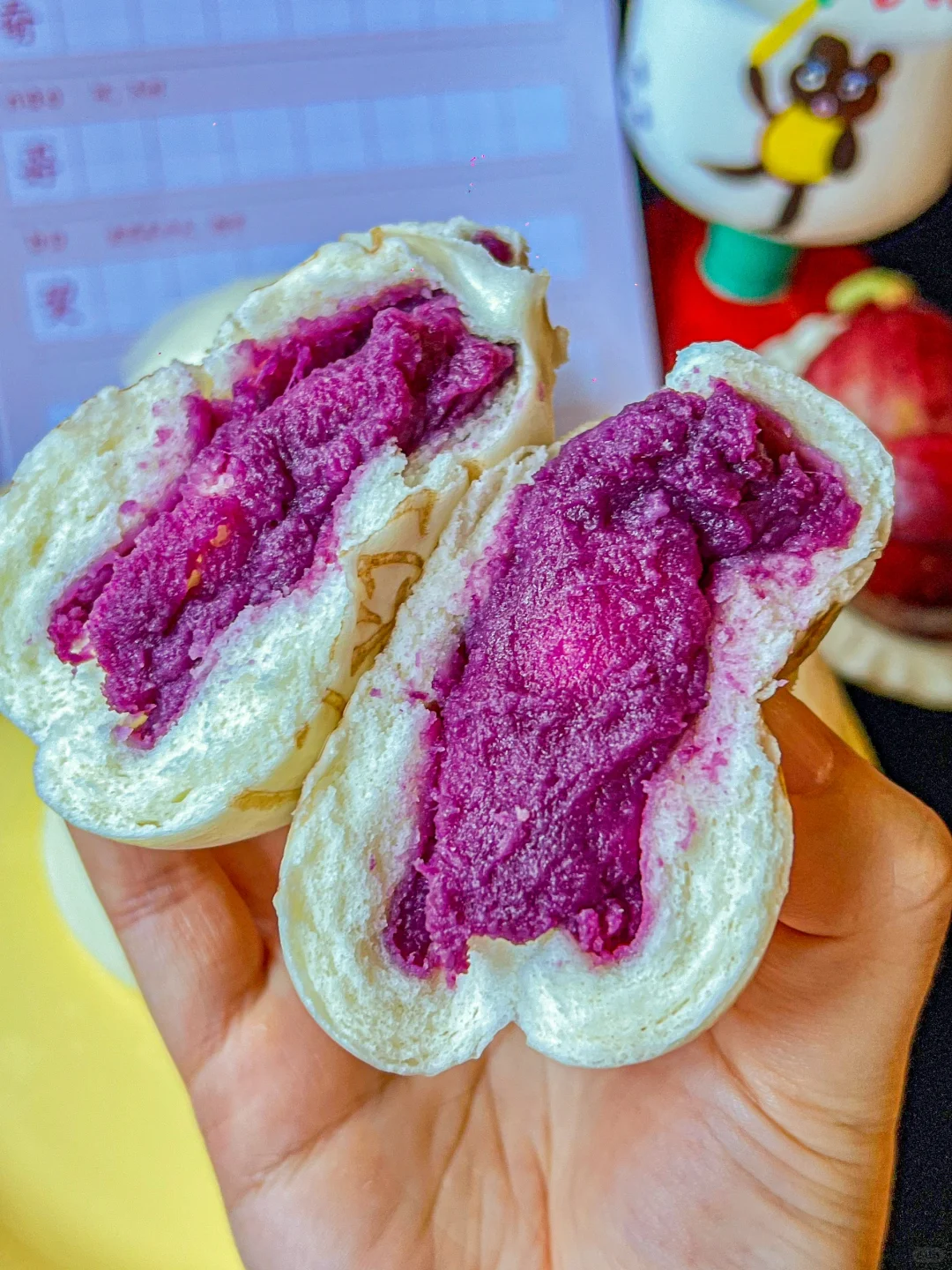 怎么连叮咚买菜都卷起来了?? 买这个紫薯芝士包居然还送练字本! 笑亖…真的就是童年记忆里的作业本! 紫薯芝士包一袋有六个,两人份早餐够够了 紫薯馅里加了丝滑的芝士,很顺滑!! 外皮也是足够蓬松香软,吃起来奶fufu的~ 要不是刚出锅有点烫嘴,我指定一口吞完