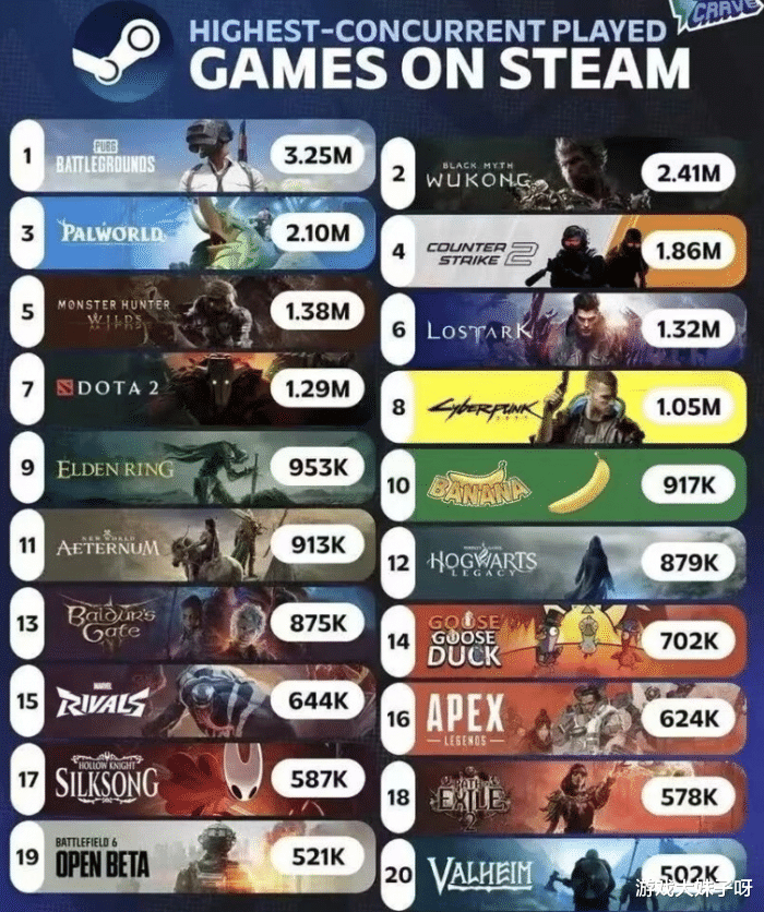 Steam同时在线人数排行榜,黑神话241万排第二,第一名达325万,近日,外媒公布了Steam平台最新的同时在线人数数据,引发了玩家们的热议,从榜单来看,《绝地求生》依旧保持着顽强的生命力,以325万人次的峰值稳居榜首。