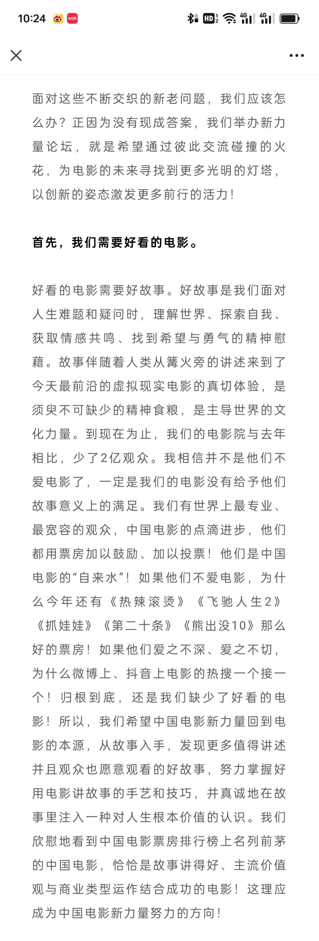 解决内地电影困局把对好看的电影的需求放在首位。到现在为止,我们的电影院与去年相比,少了2亿观众。我相信并不是他们不爱电影了,一定是我们的电影没有给予他们故事意义上的满足。我们有世界上最专业、最宽容的观众,中国电影的点滴进步,他们都用票房加以鼓励、加以投票!