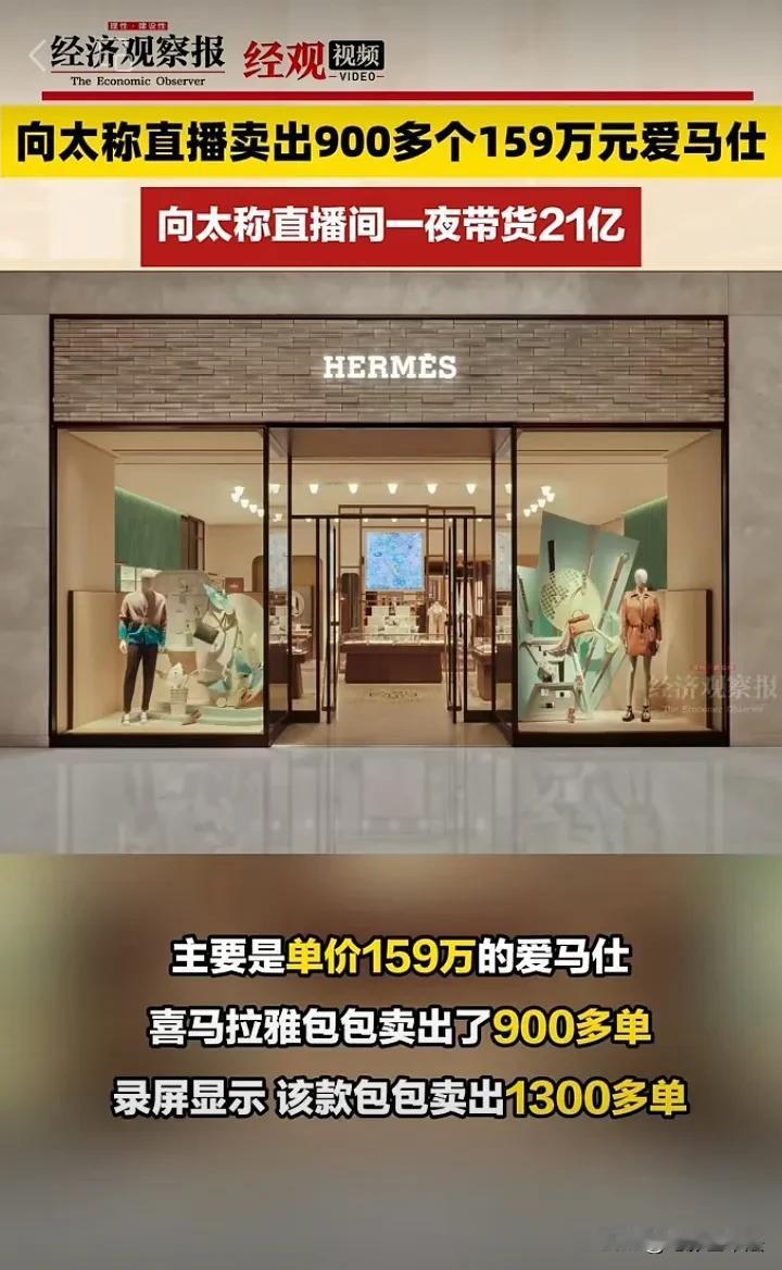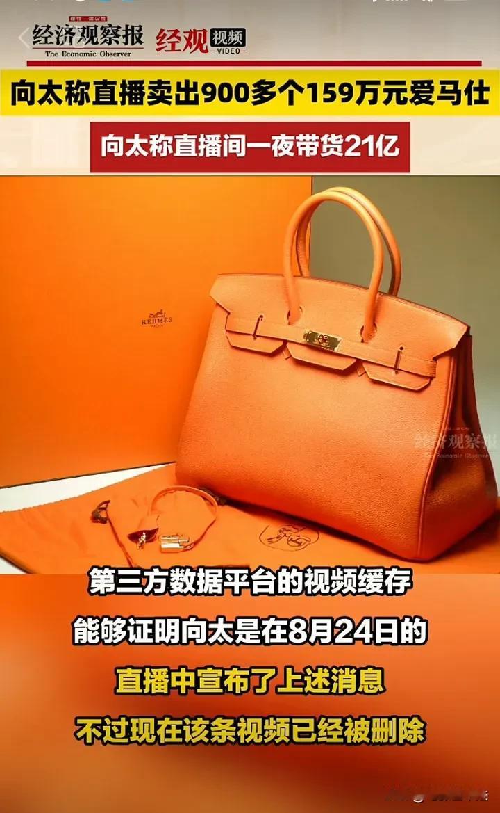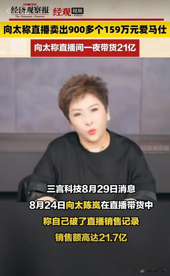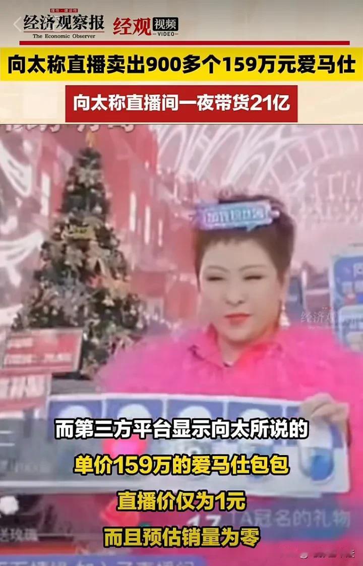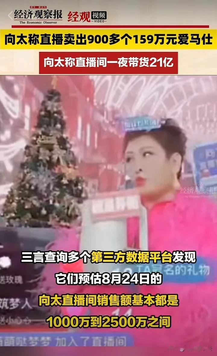 向太厉害了,直播间一夜带货21.7亿! 8月29日,大家要么在吃俞敏洪罗永浩董宇辉的三角瓜,要么在吃王思聪私生女和男同瓜,要么在吃金巧巧于冬离婚瓜,这时向太突然出其不意的冲上热搜。 原因是有媒体在8月29日曝光,向太8月24日在直播间称自己打破了直播销售记录,一夜销售额高达21.7亿,其中包含900多个价值159万的爱马仕包包。 虽然目前视频已被向太删除,但在第三方数据平台的缓存中能够证明向太确实公布了一夜21.7亿的销售数字。 网友看后笑喷了,纷纷调侃: 其中一个是汪小菲买的吧。 900多个喜马拉雅? 只要能按这个数字上税,我就相信向太。 太高明了。 土豪圈看不懂。 左手捣右手? …… 不管数据是真是假,都很佩服向太,如果属实,那向太就太厉害了,如果向太口中数据不属实,那向太也太敢说了,这勇气你不得不佩服!