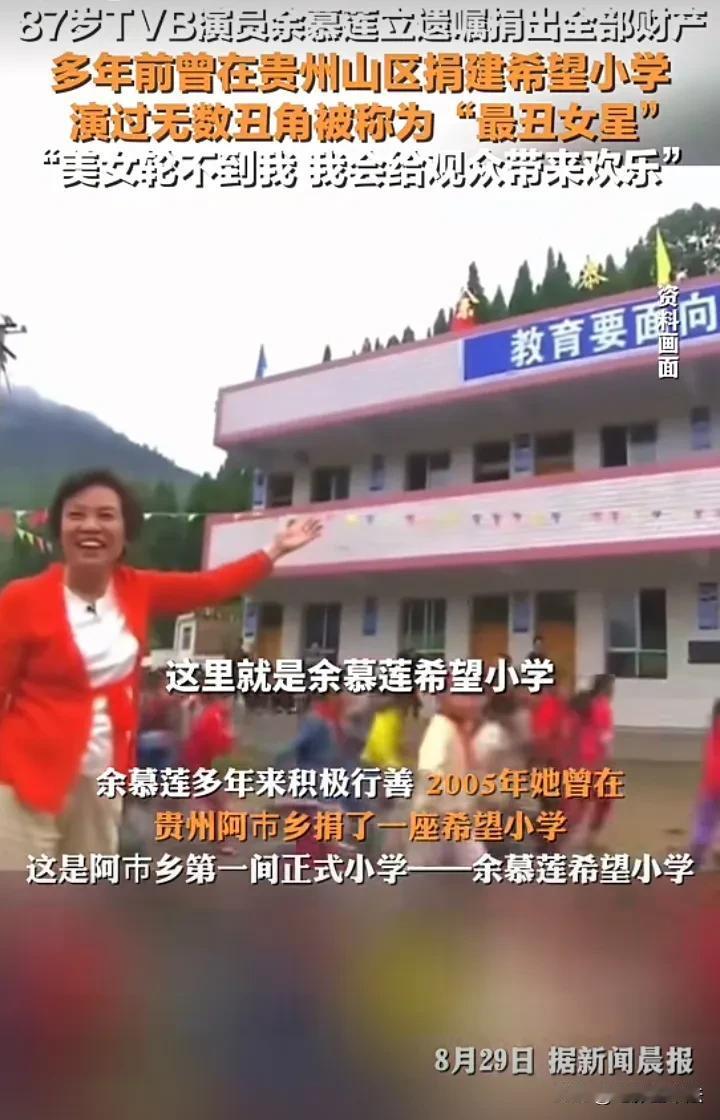 87岁TVB女演员,捐出全部财产! 8月29日,有媒体报道,现年87岁的TVB女演员,演过无数丑角的余慕莲接受专访,再次声明已经立下遗嘱,离世后捐出全部财产,房子捐给东华三院,储蓄全部捐给慈善机构。 余慕莲1937年出生于广州,8岁时父母离异随母亲到香港发展,因为母亲是粤剧演员,余慕莲从小耳濡目染,长大之后也进入了演员行业。 虽然因为形象问题,演的虽然都是小角色还是丑角,但她的专业与敬业,深受专业人士认可和观众欢迎。 因为童年父母离异带来的心灵创伤,余慕莲87年从没有谈过恋爱,更没有子女,唯一一次绯闻是1995年和曹达华,但她坚决否认。 她曾透露有一年有人向她求婚,但她觉得一个人衣食无忧无忧无虑很开心,于是就拒绝了人生中唯一一次被求婚,但她不觉得这是遗憾。 2019年开始,余慕莲先后患上耳石症、肺纤维化等病,身体状态每况愈下。 但她的心态非常好,一直热心慈善,2005年在惠州市阿市乡捐赠了一所希望小学,退休后一直长期参加慈善活动。 在8月29日的专访中,她最感谢的是多年来一直支持她的观众,她说: “不怕死,没有遗憾,希望大家记得我,我搞笑的,美女轮不到我,我会给观众带来欢乐!” 她是一个高尚的人,也许你不知道她的名字,但你一定看过她演的电影,你还记得她有哪些经典角色吗?