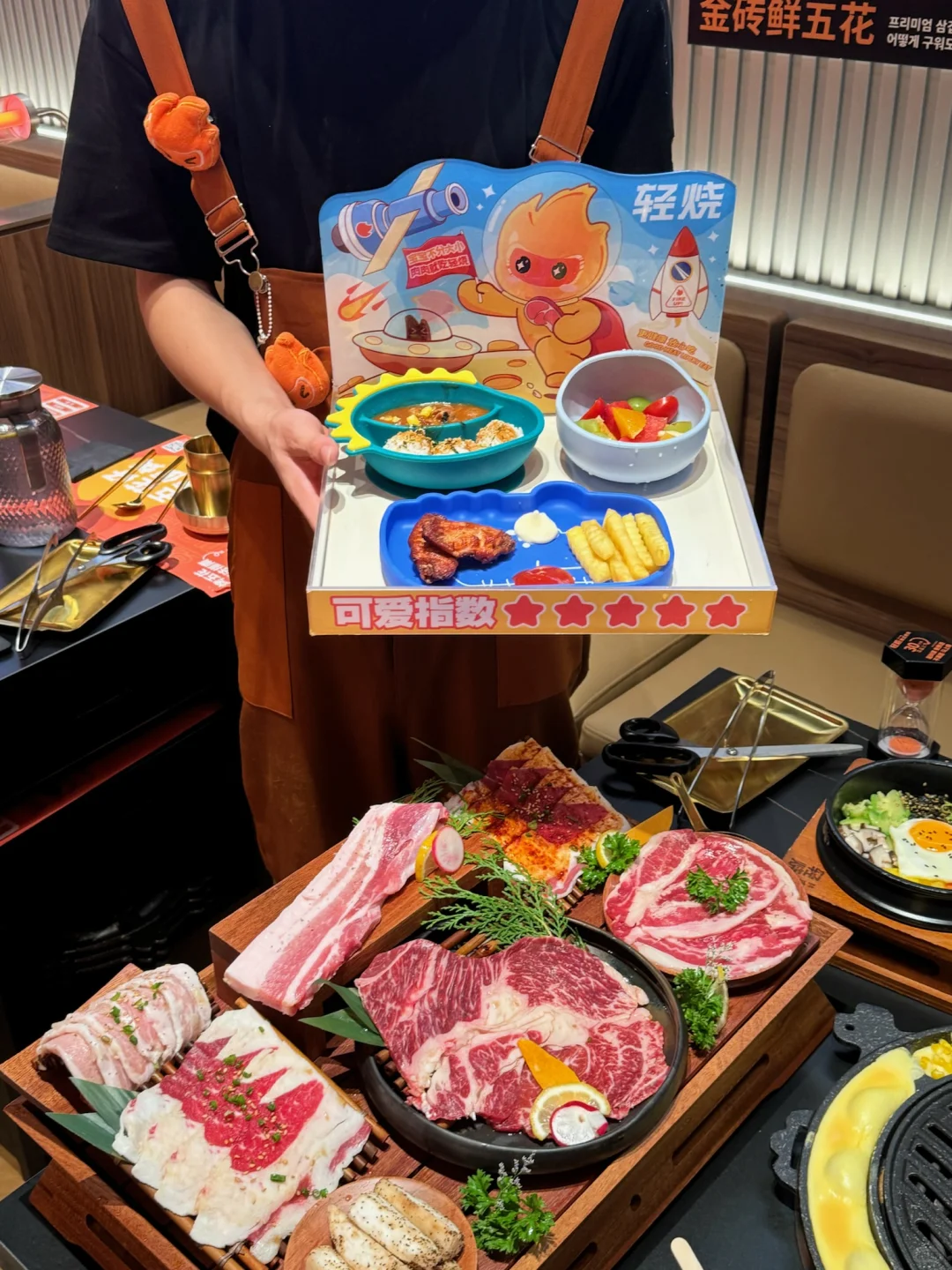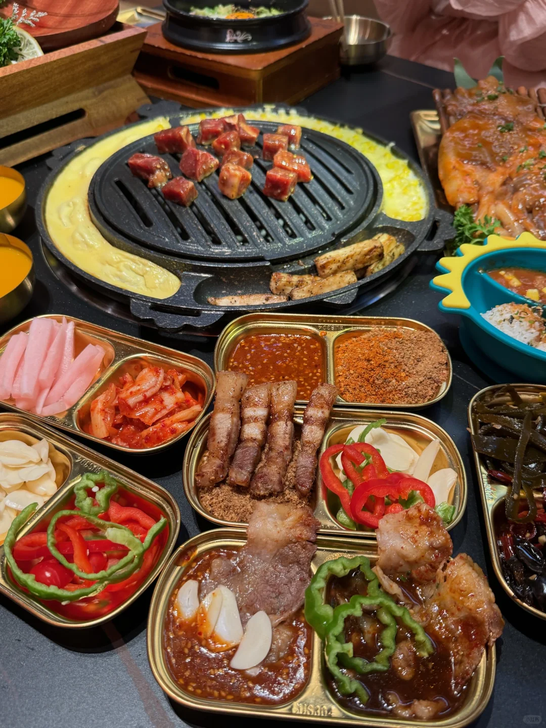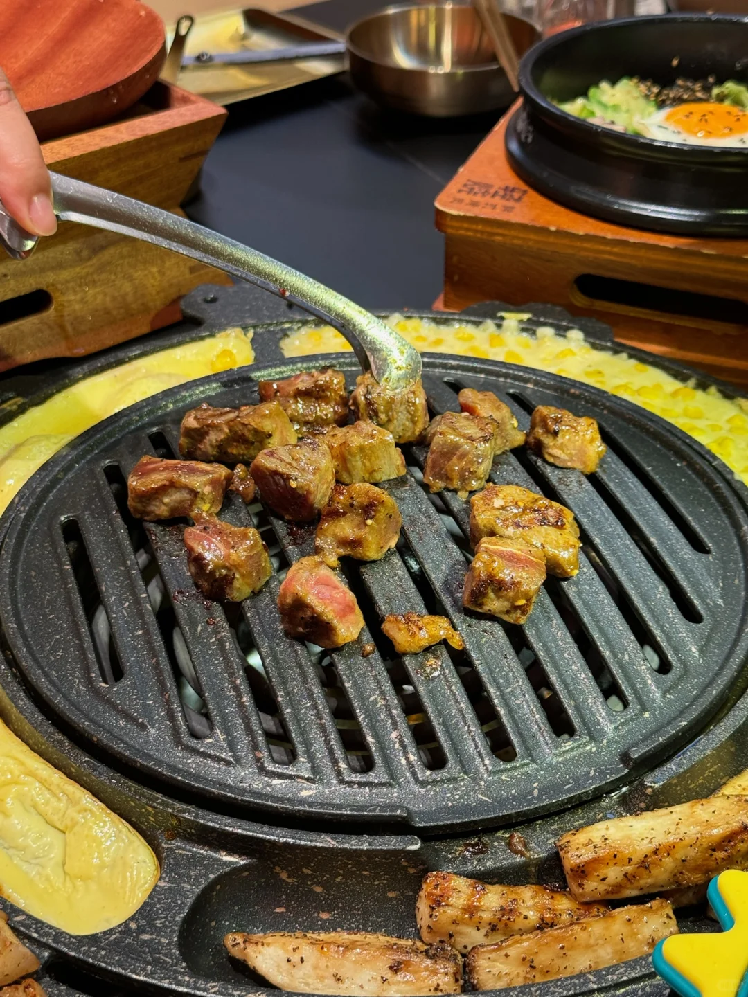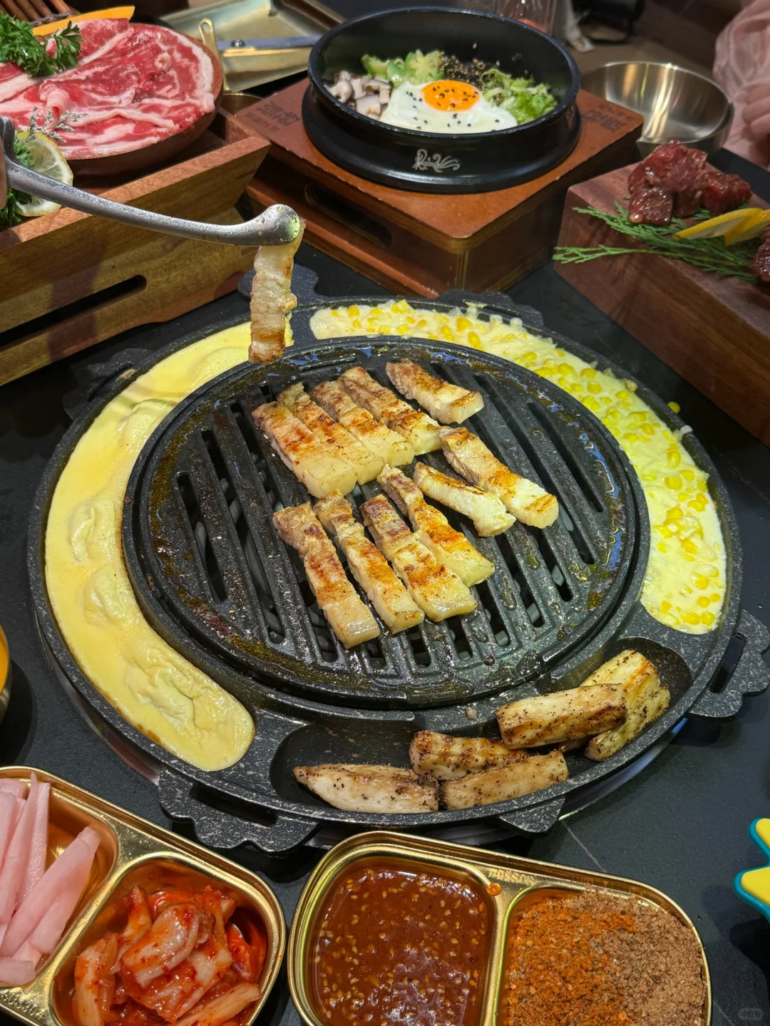 吃了78910次的、反反复复爱上他家烤五花 烤焦一点,蘸韩式酱好香、 还有口口爆汁的牛肉粒,真嘟贼嫩 安格斯肥瘦、孜然大鱿鱼、雪花牛排每次都点 用生菜卷着+蒜片贼香贼好吃😋 - 蒸蛋、芝士玉米、南瓜泥无限续➕ 大学生的聚集地啊啊啊啊、