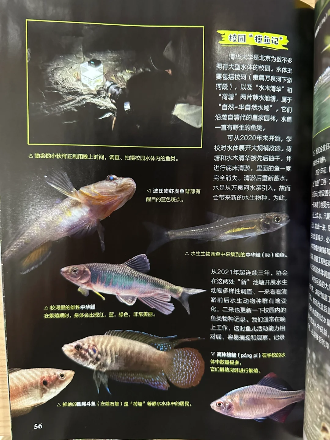 清华可能是北京鱼类资源最为丰富的高校,带着一大帮同学“摸鱼”,调查水生生物,也是动物协会的日常。甚至还专门成立了“清华大学摸鱼群”,群成员超过了200人。我们在校园里记录到了中华𫚭(俗称溪哥)的繁殖。去年夏天,校河里诞生了清华鸟类新纪录:冠鱼狗和牛背鹭,以及不少鱼类新记录。经过整理汇编,现在清华园终于也有了自己的鱼类名录和图集。