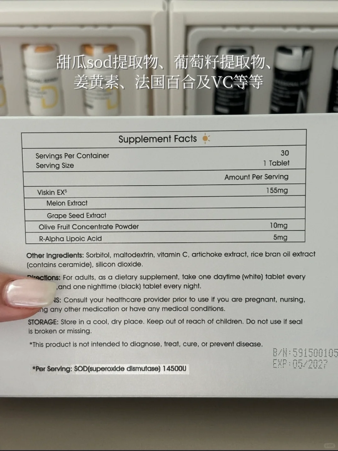包含14500U的抗氧化sod、葡萄籽精华、VC等等