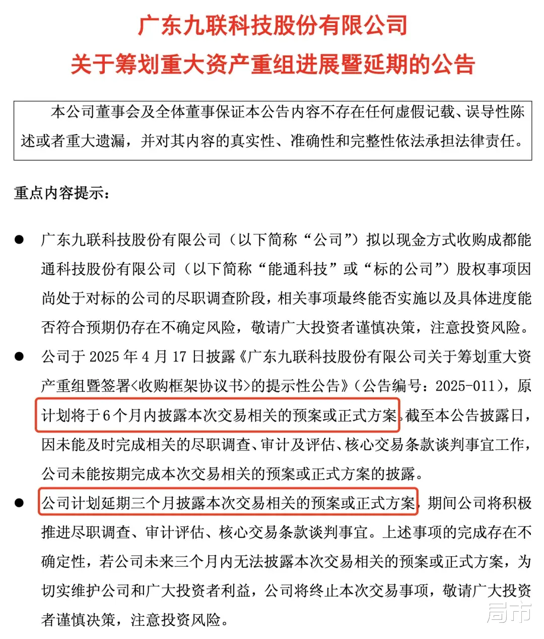 10月16日,九联科技发布公告,计划延期三个月披露重大资产重组预案或正式方案。