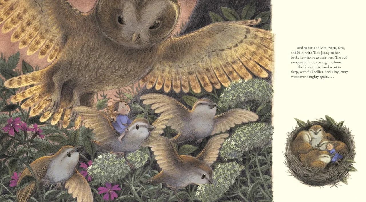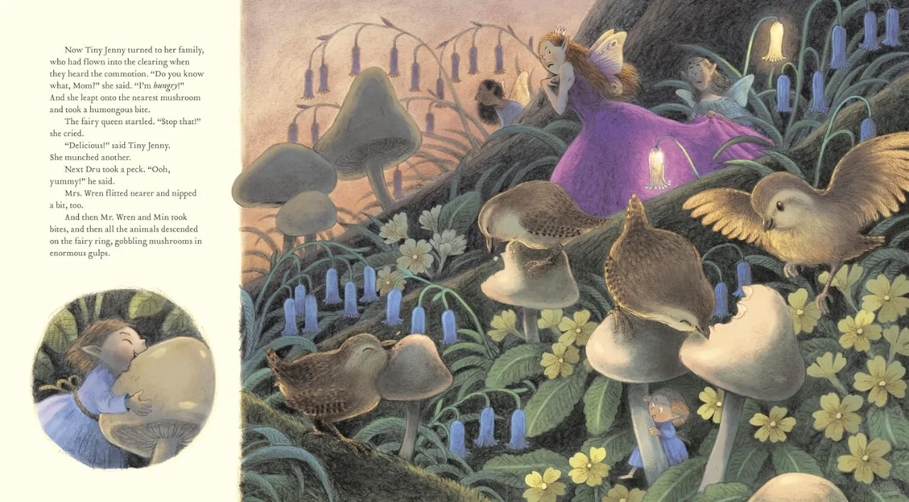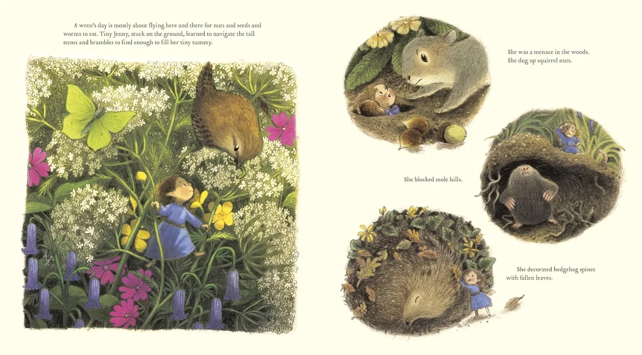 由于无法像其他鹪鹩孩子一样飞起来寻找食物,小珍妮在荆棘中寻找食物,挖松鼠坚果,堵鼹鼠丘,最终造成了很多麻烦。当小珍妮无意中听到邻居们向雷恩夫妇抱怨时——“你怎么能让仙女在树林里闹事?”