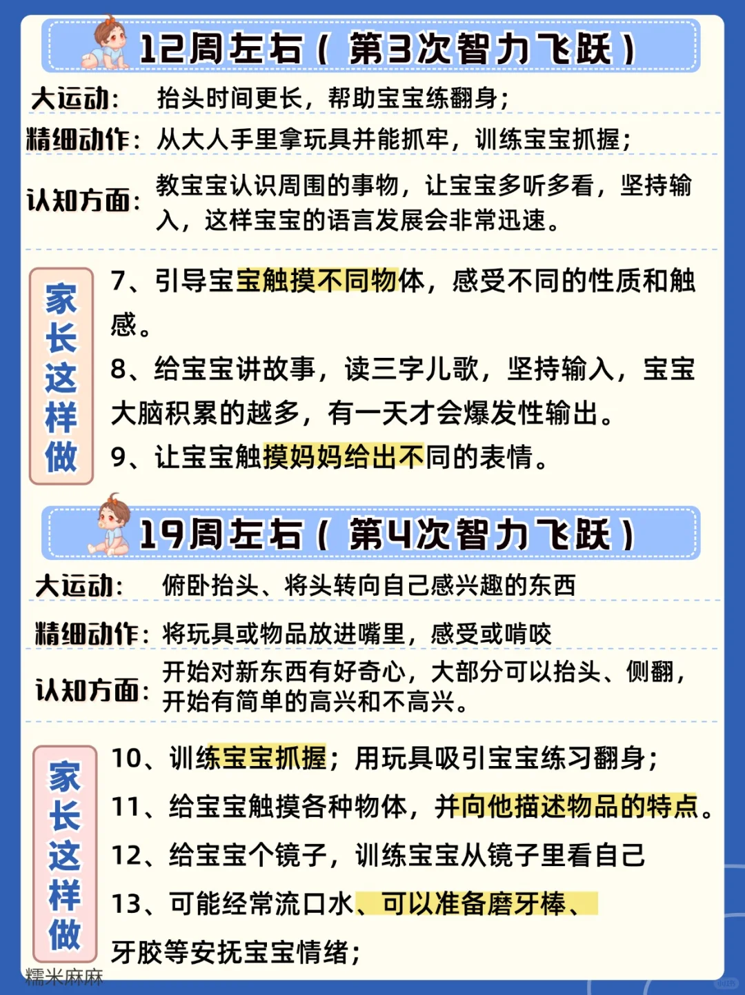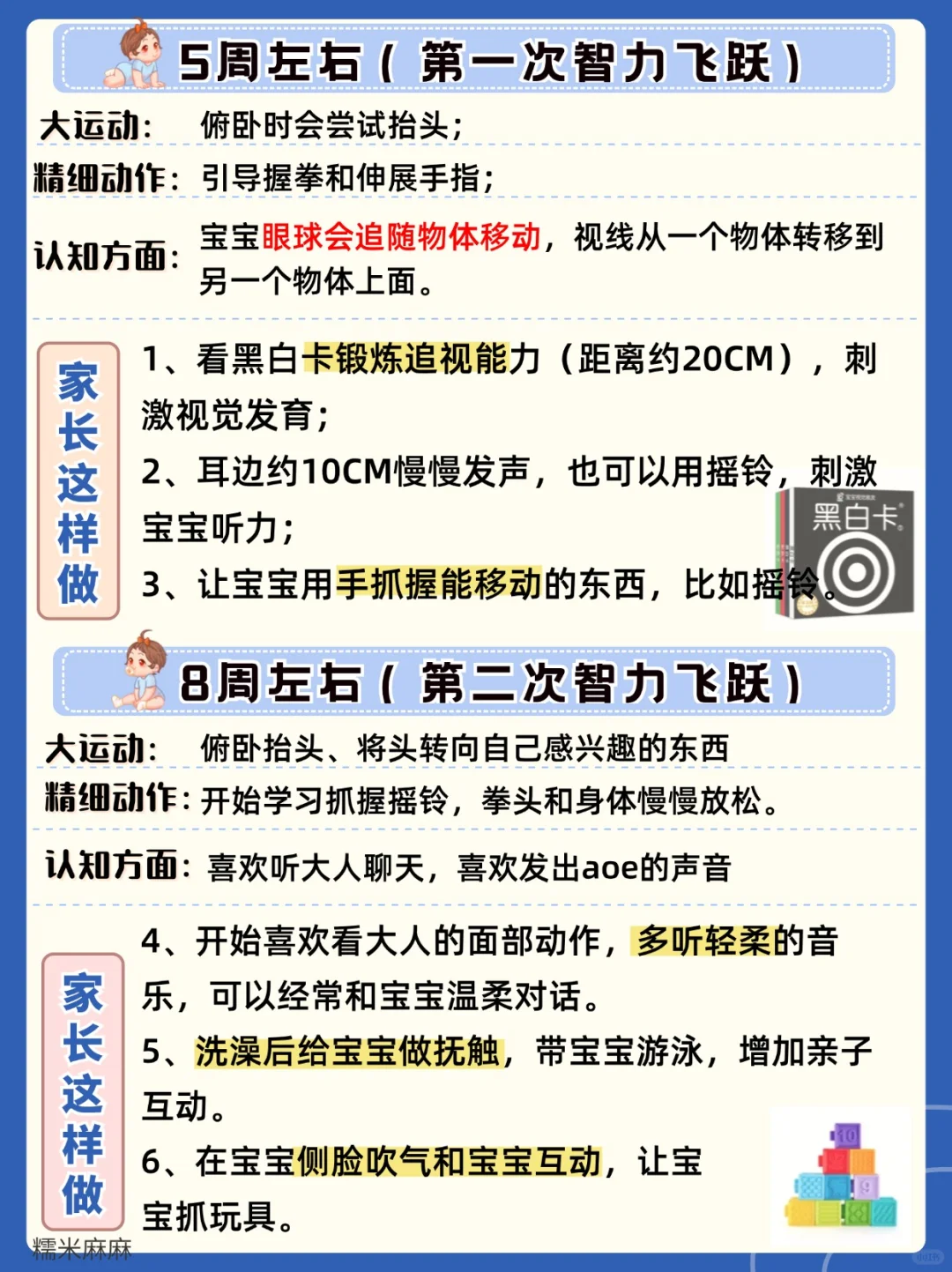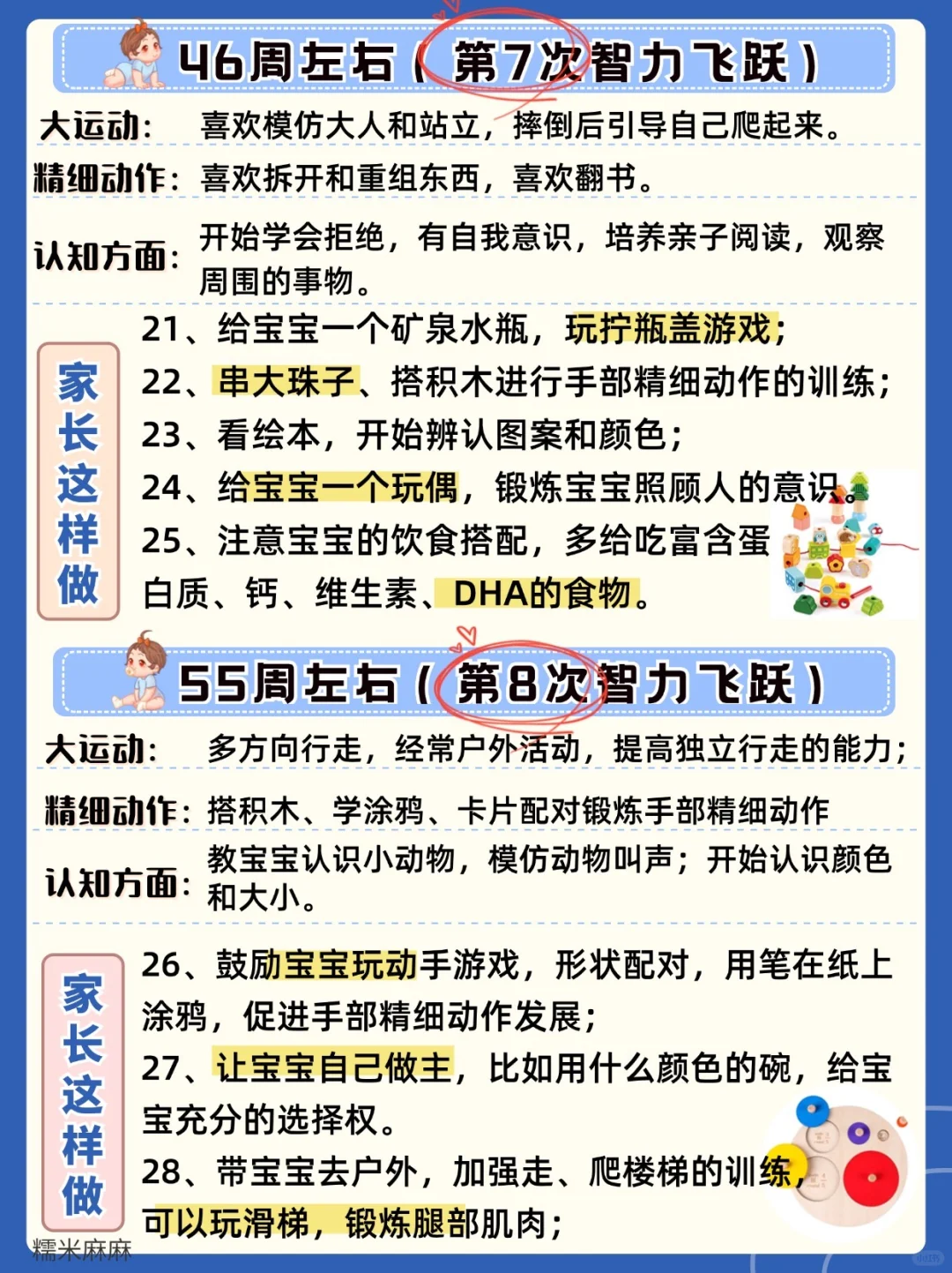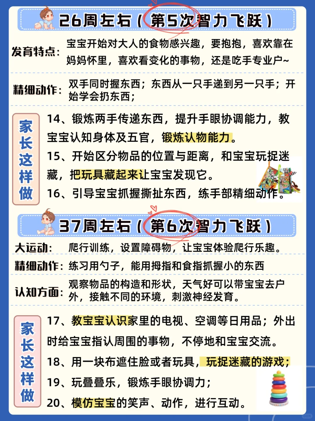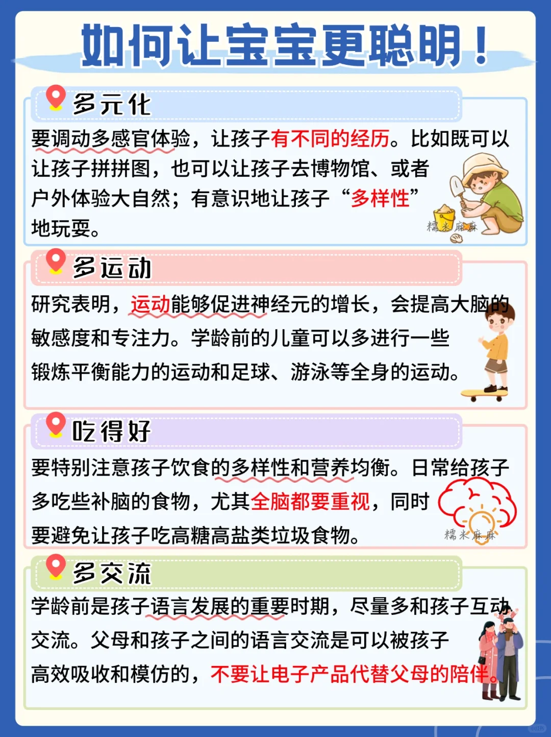 智商很大程度上是由先天决定的,对于我们大部分普通的孩子来说,怎么变成“聪明孩子”呢?方法就是科学干预,提高我们的认知能力。 今天主要从三个方面整理了0-3岁不同阶段如何跟宝宝互动,可以转发给家人一起陪宝宝玩💪🏻 ✅精细动作 ✅思维认知 ⭐️家长和宝宝的互动小游戏 宝宝的成长离不开家长的陪伴,不一定需要多少玩具,可能一个空瓶子宝宝就能玩小半天哦,所以每天抽时间高质量的陪伴很重要哦~