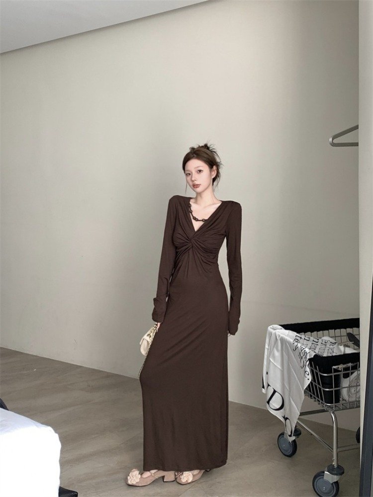 法式赫本风V领长袖连衣裙女早秋