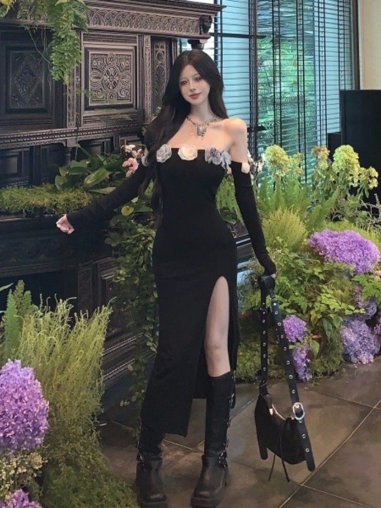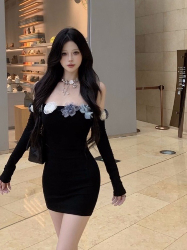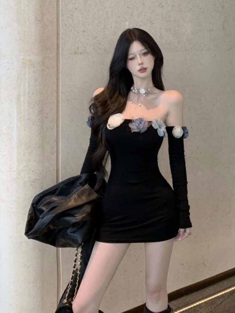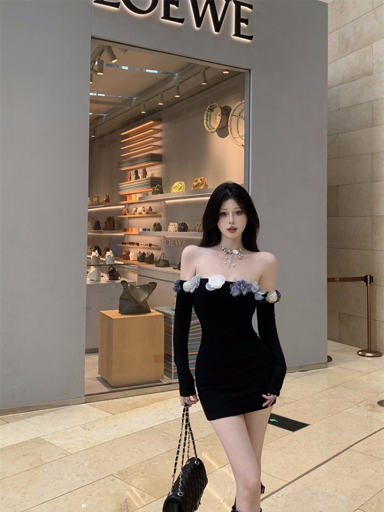 早秋穿啥?这黑裙一字肩,时尚不冻人,面料保暖又透气,完美过渡季穿搭