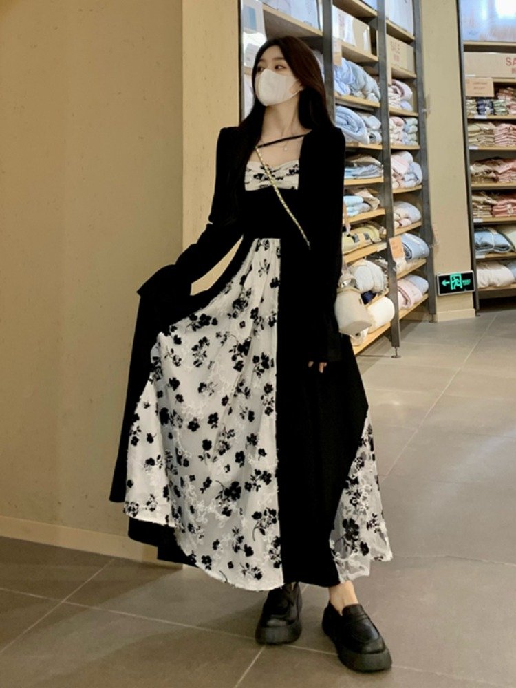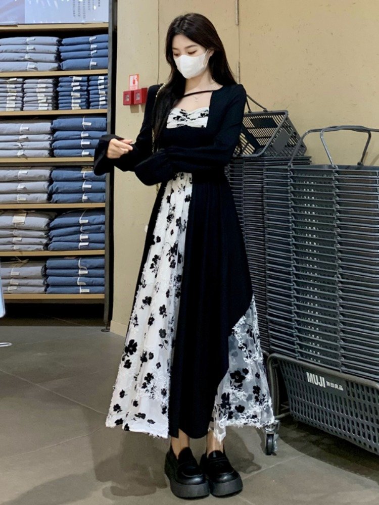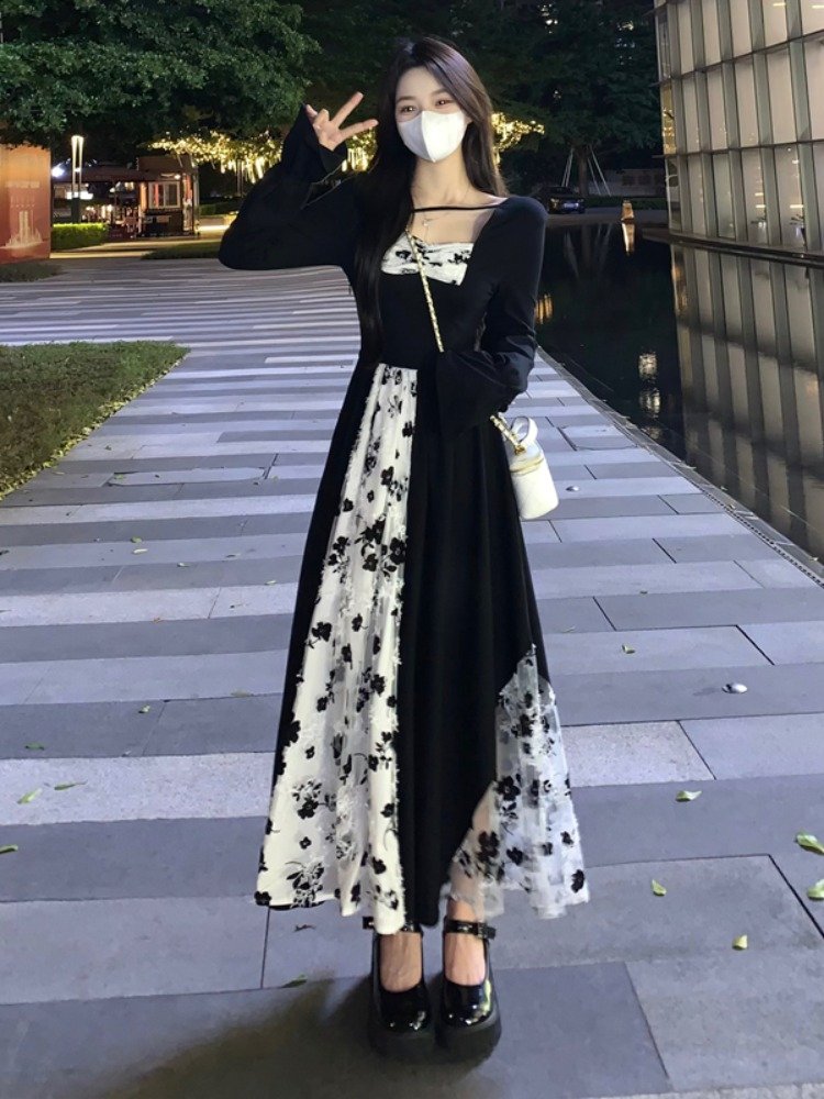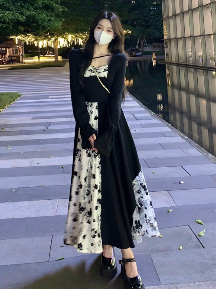 法式气质黑色方领拼接蕾丝长袖连衣裙女