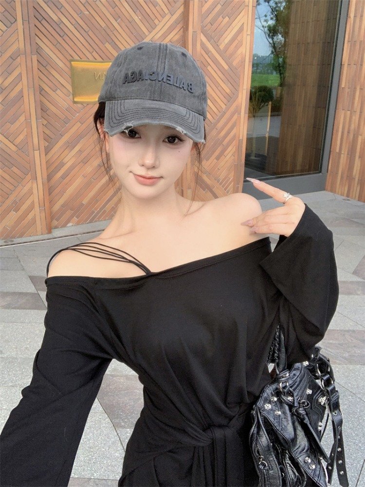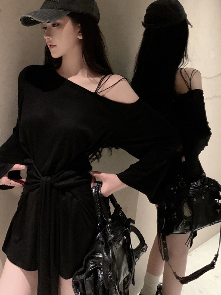 纯欲辣妹黑色露肩长袖连衣裙女