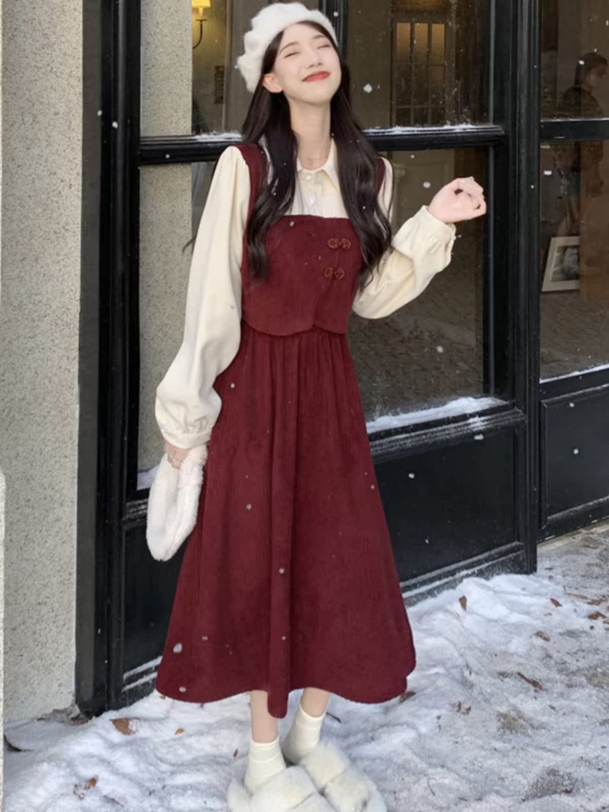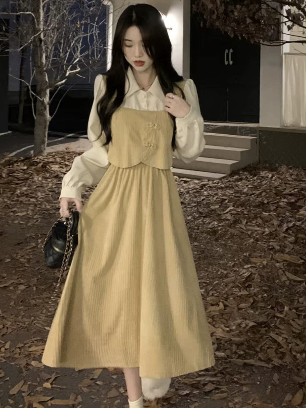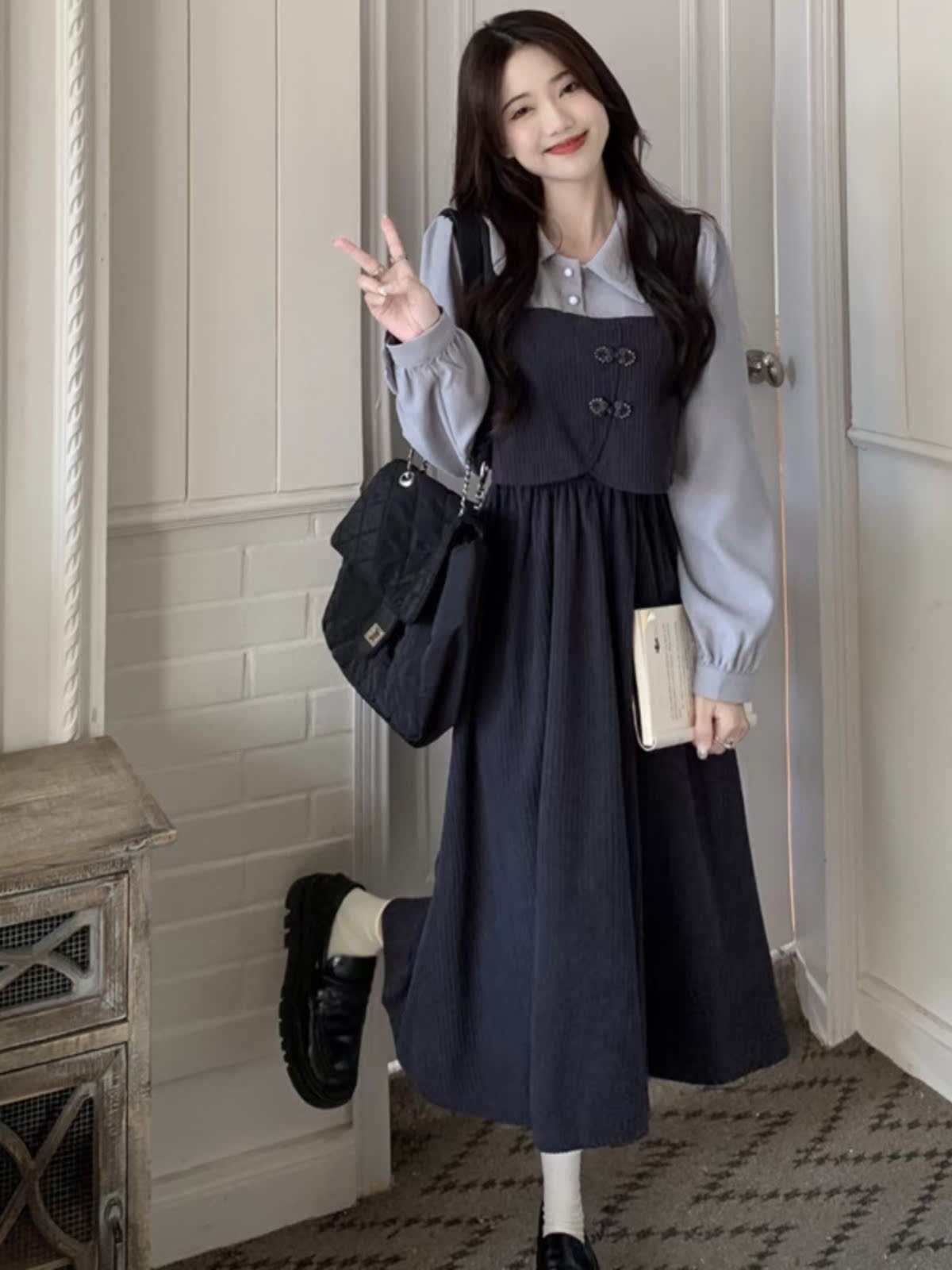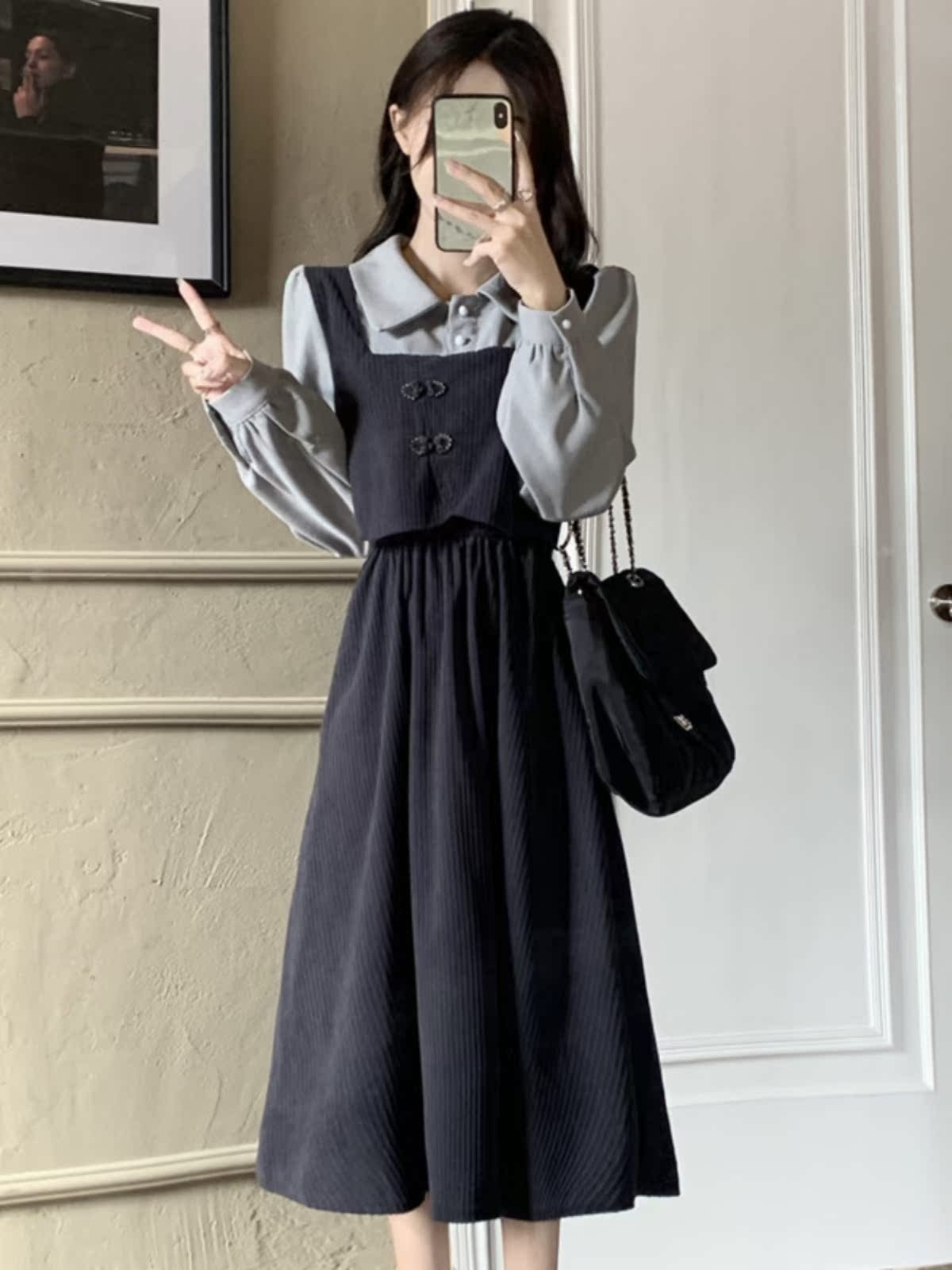 法式假两件Polo长袖连衣裙女