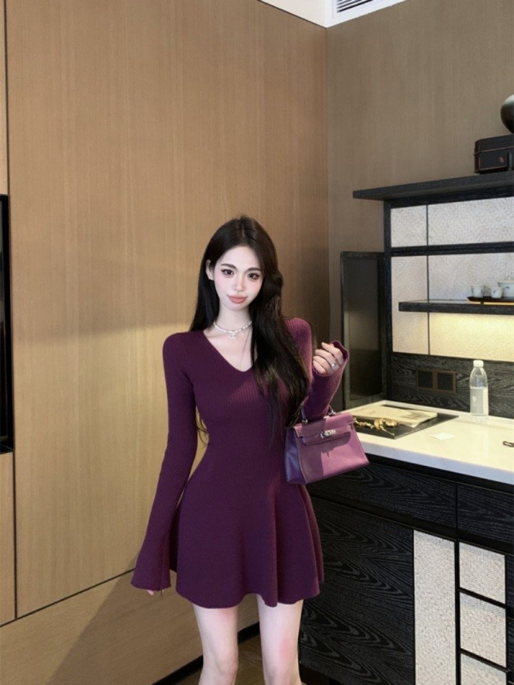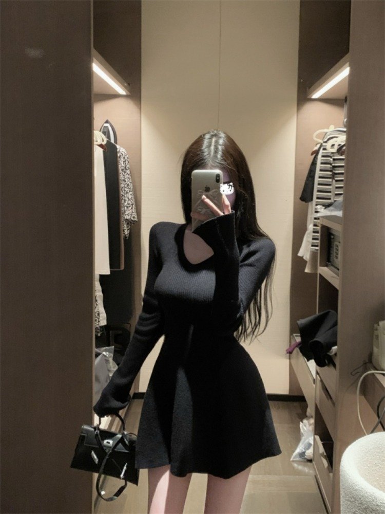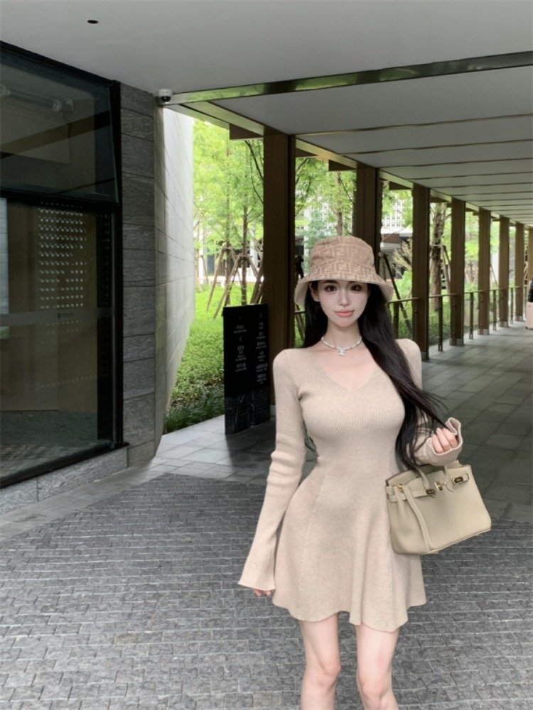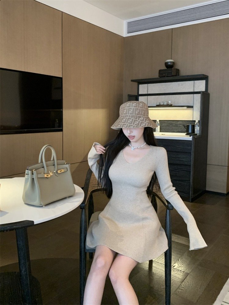 纯欲风辣妹针织V领长袖连衣裙女
