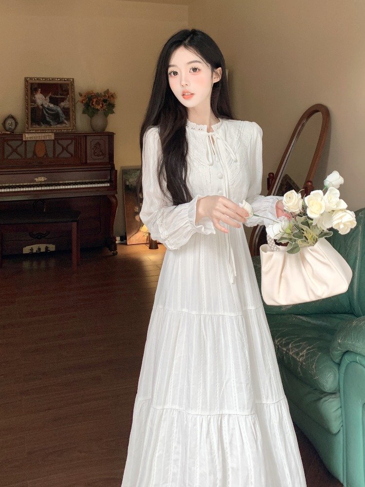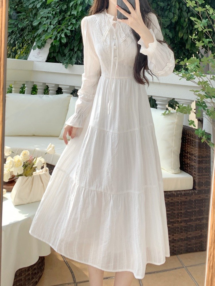 法式气质白色蕾丝长袖连衣裙女