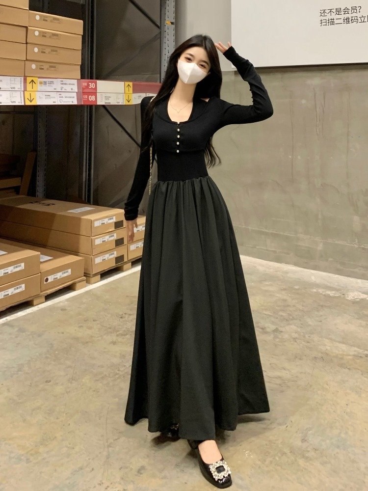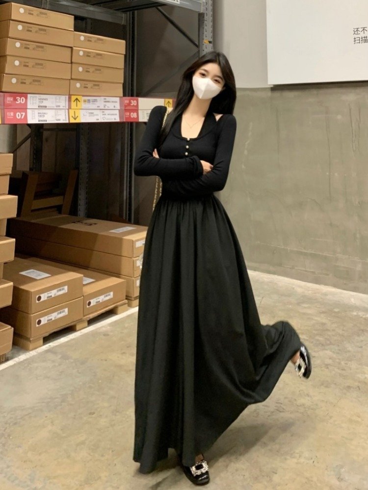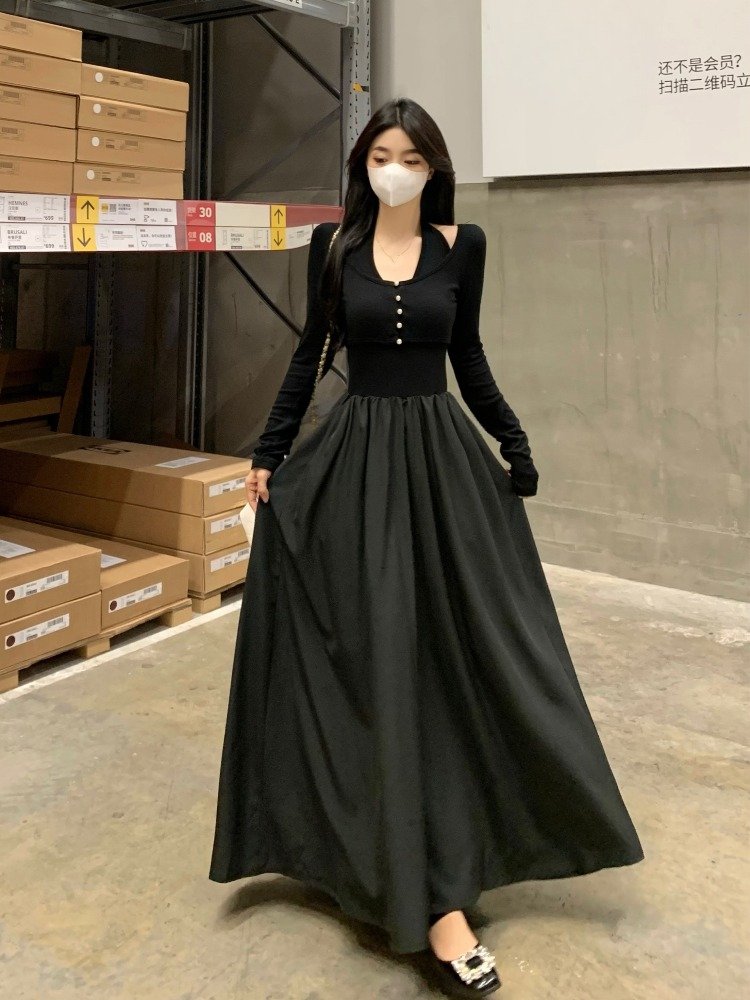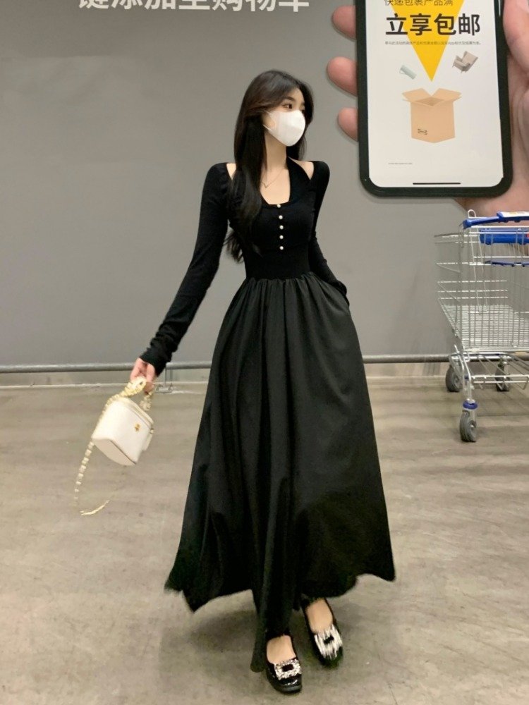 法式赫本风针织假两件挂脖连衣裙女