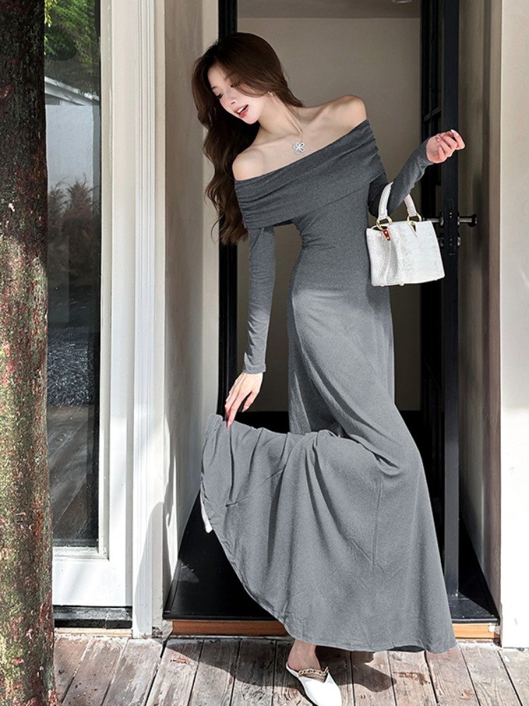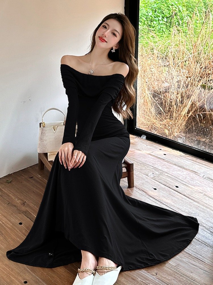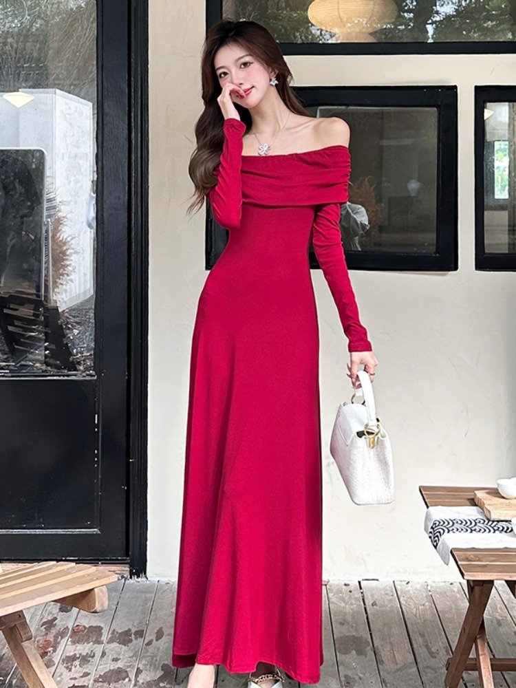 法式高级感红色一字肩长袖连衣裙女