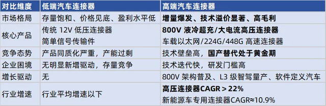 03结构性分化连接器行业低端熄火,高端狂飙站在2026年节点,汽车连接器赛道呈现清晰的"冰火两重天"格局:低端市场存量饱和、价格见底,高端领域增量爆发、技术溢价显著。