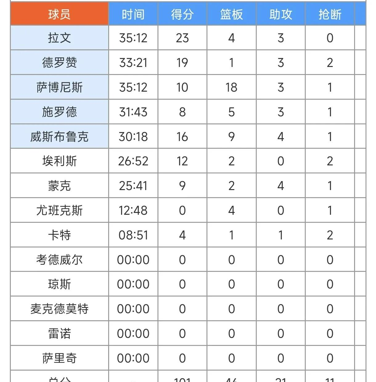 国王首发:拉文、德罗赞、萨博尼斯、施罗德、威斯布鲁克。