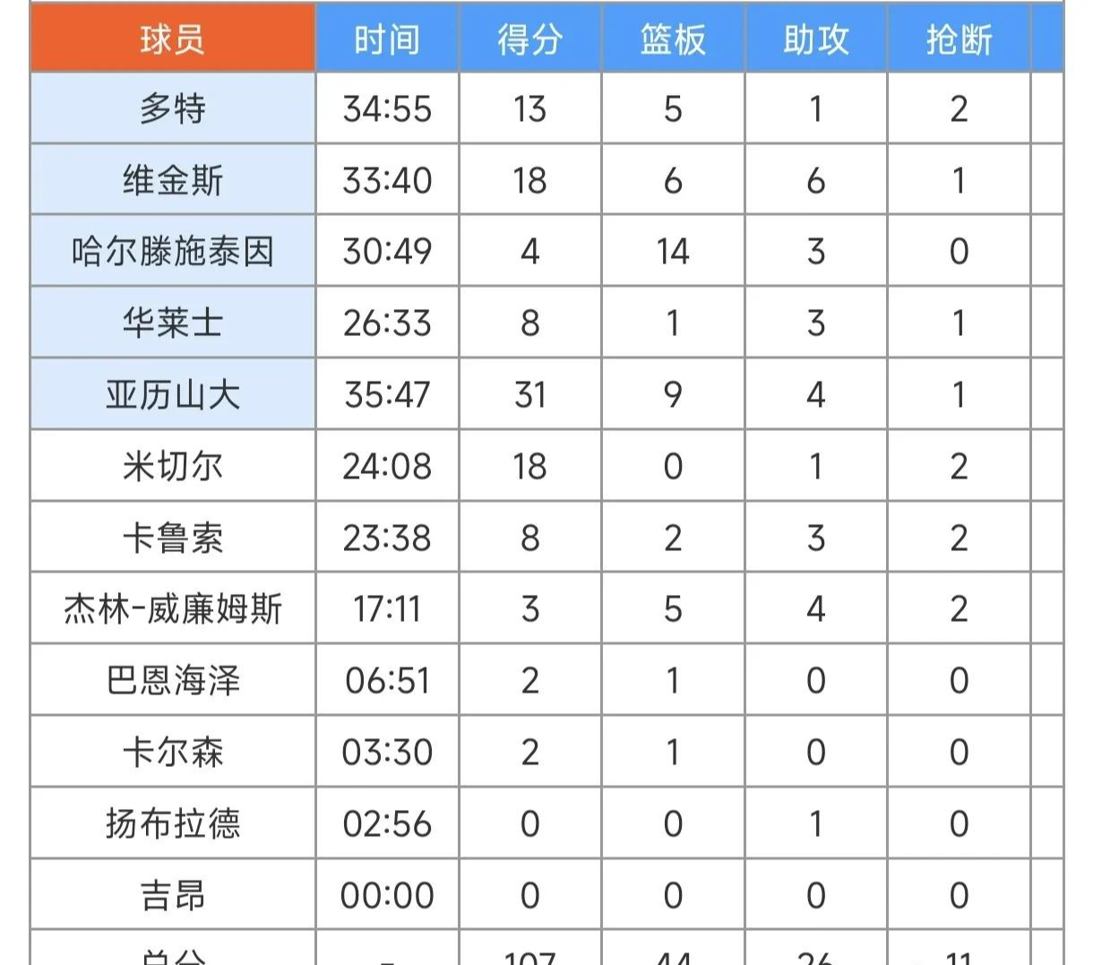 比赛数据,威少拿到16分,德罗赞拿到19分,萨博尼斯拿到10分18个篮板3次助攻,施罗德拿到8分。亚历山大拿到31分,米切尔拿到18分,维金斯拿到18分,多特拿到6分。