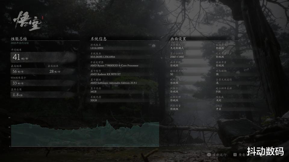 「黑神话悟空」游戏在2K分辨率下影视级画质,全景光线追踪-高,选择开启FSR ,帧生成:关闭,超级采样率50时游戏平均帧:41 FPS,最低帧:28 FPS。