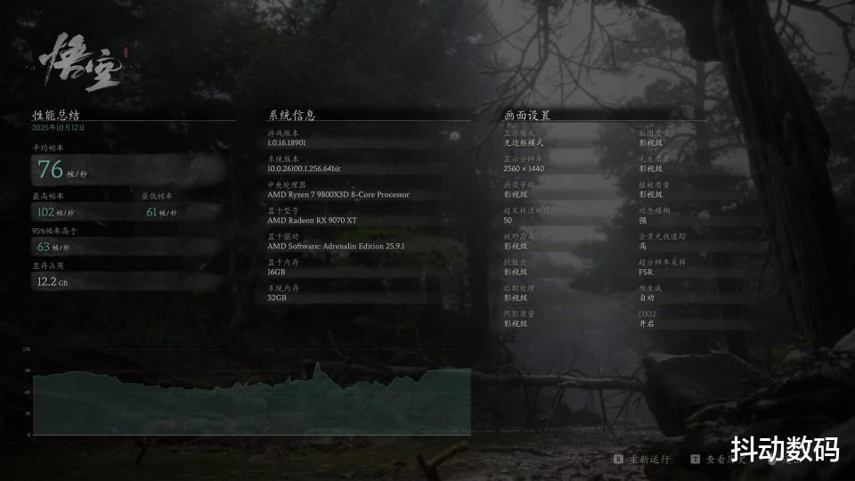 「黑神话悟空」游戏在2K分辨率下影视级画质,全景光线追踪-高,选择开启FSR ,帧生成:自动,超级采样率50时游戏平均帧:76 FPS,最低帧:61 FPS。