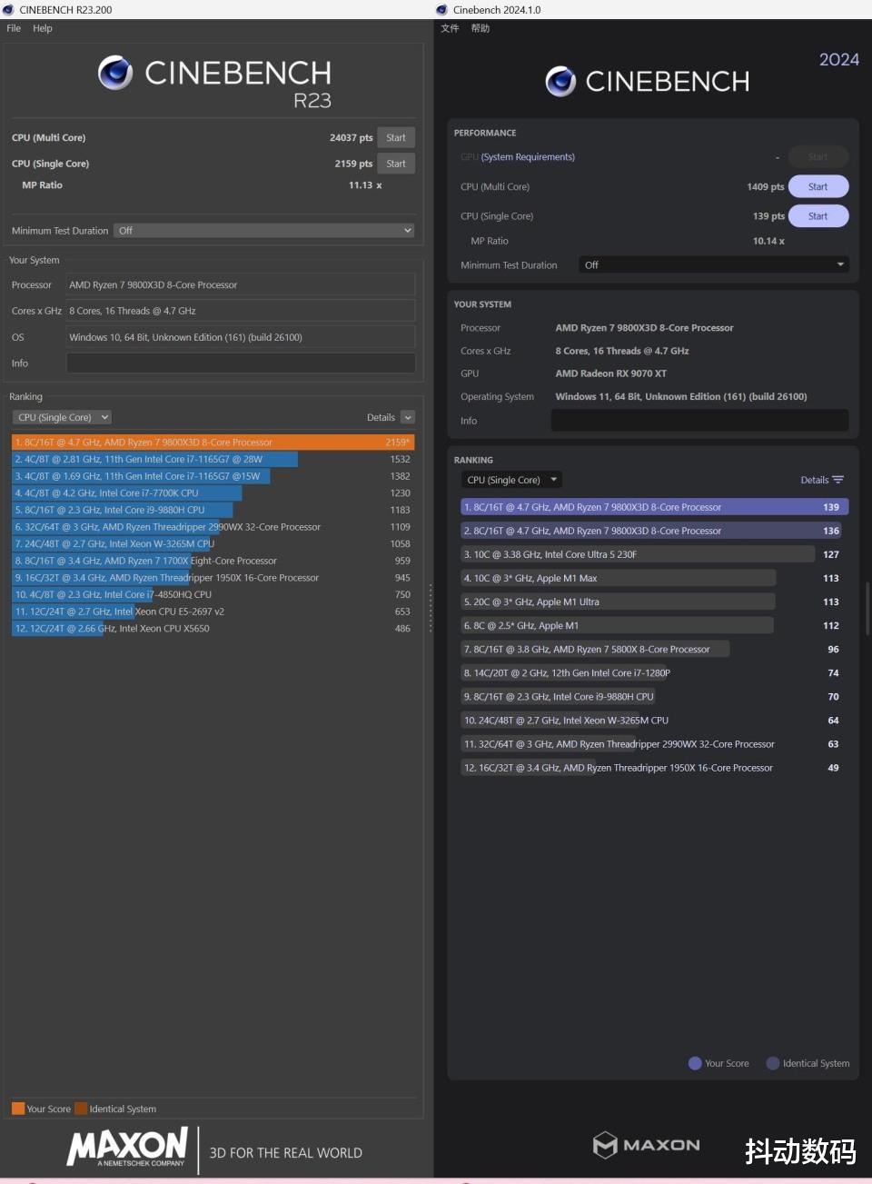 同样开启PBO 2之后的CINEBENCH R23以及2024测试成绩如图,通过测试也可以看到即便搭配这样一张799元的主板,也不会影响9800X3D开启PBO 2之后的性能释放的。