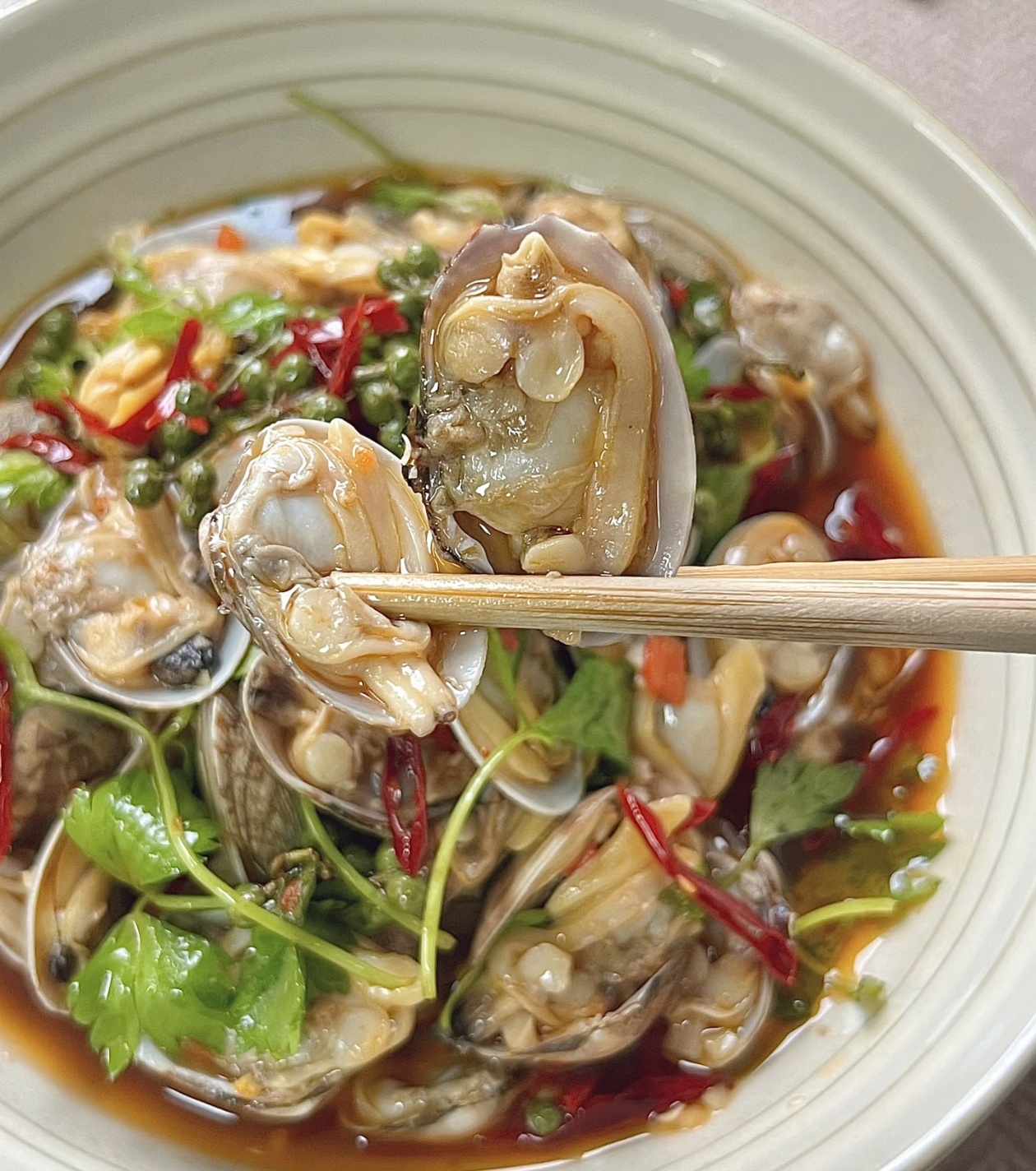 做好的炝拌芥末花甲,红亮的料汁裹着饱满的花甲肉,青花椒和香菜叶点缀其间,光是看着就让人食指大动。用筷子夹起一颗,送进嘴里,先是热油激发的椒香,再是芥末带着的一丝冲劲,混着花甲的鲜甜和料汁的酸辣,层层叠叠的味道在舌尖炸开,越吃越香,越吃越停不下来。夏天的傍晚,吹着晚风,剥上一盘这样的花甲,配着冰啤酒和朋友闲聊,就是最惬意的人间烟火。这道简单又出彩的家常菜,没有复杂的工序,却能靠鲜爽的味道征服全家人的胃,学会了,就能给自家的餐桌添上一道永远不会出错的下酒硬菜。