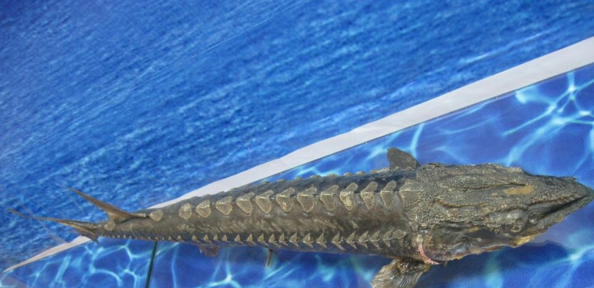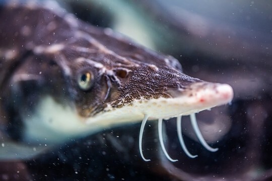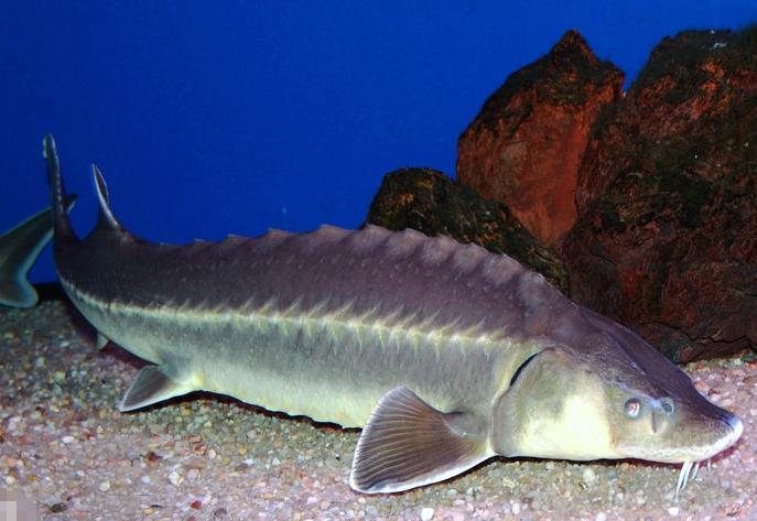 中华鲟是肉食性底栖鱼类,头部呈三角形,吻部尖长,长了四条吻须,身上没有鱼鳞,背部、体侧与腹部有五行坚硬的骨板,摸起来很粗糙。