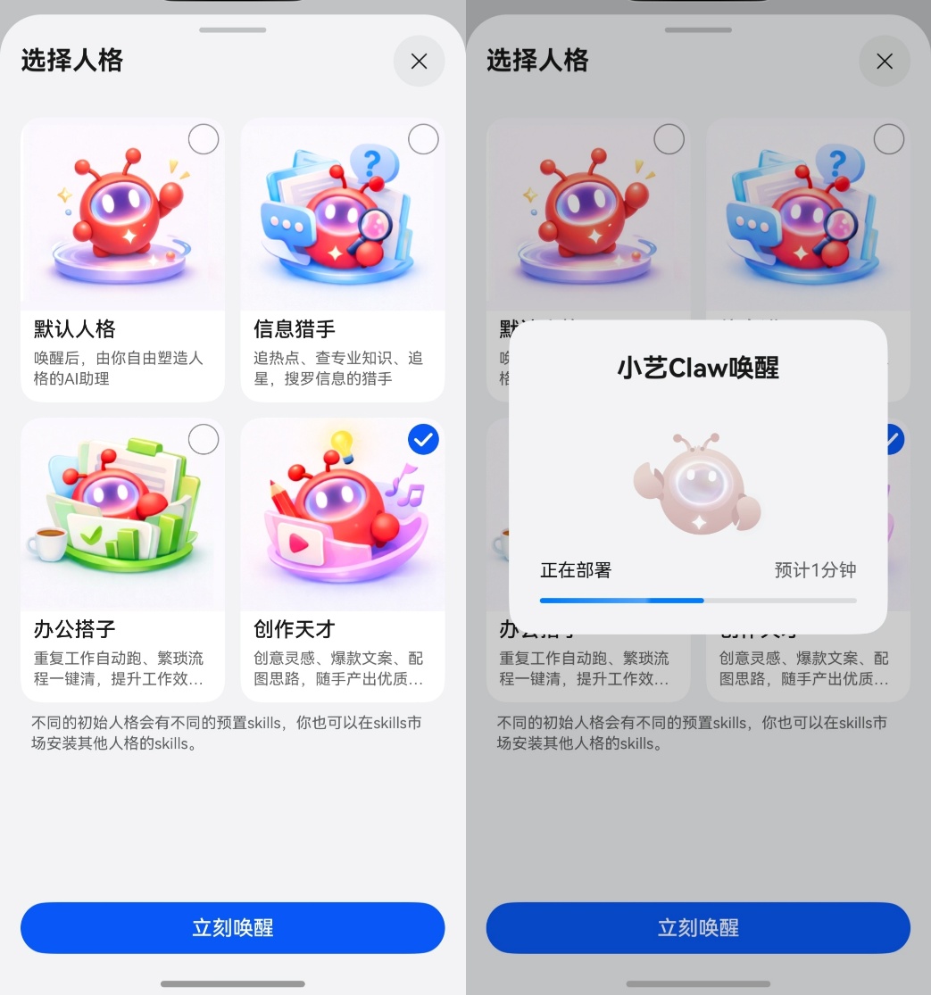 小艺Claw开局自带四大初始人格——默认人格、信息猎手、办公搭子和创作天才,实用价值拉满,一站式搞定信息搜集、办公、创作和陪伴等多场景需求。