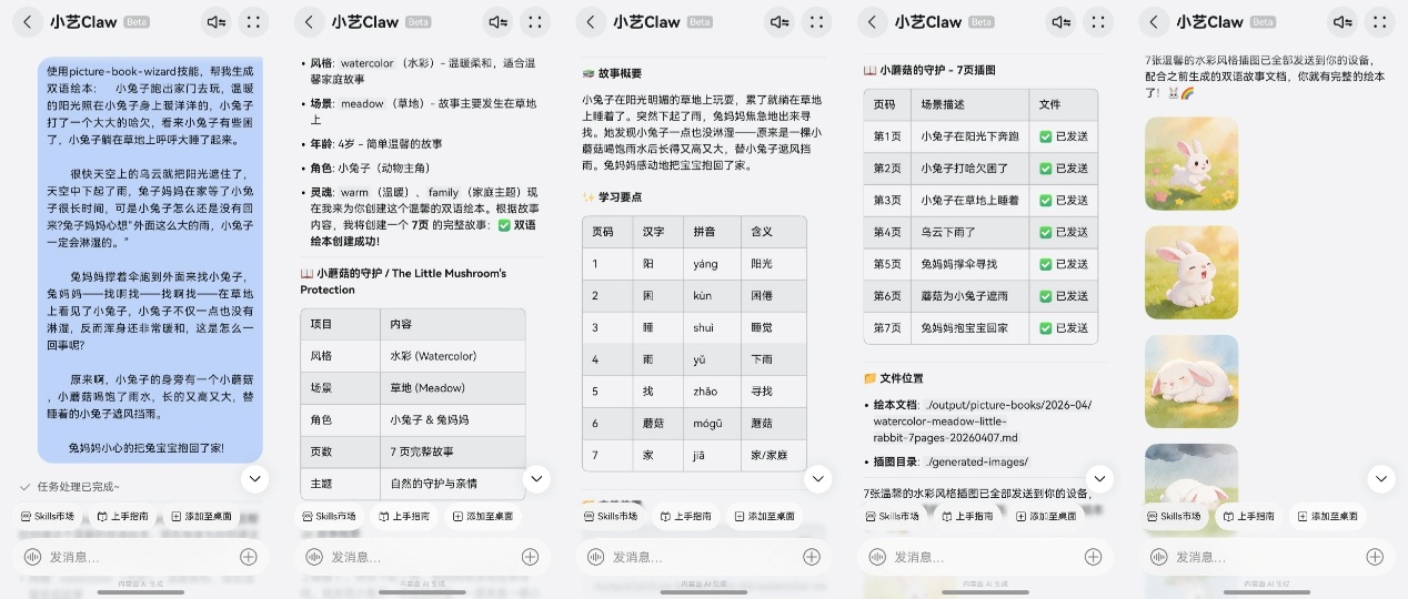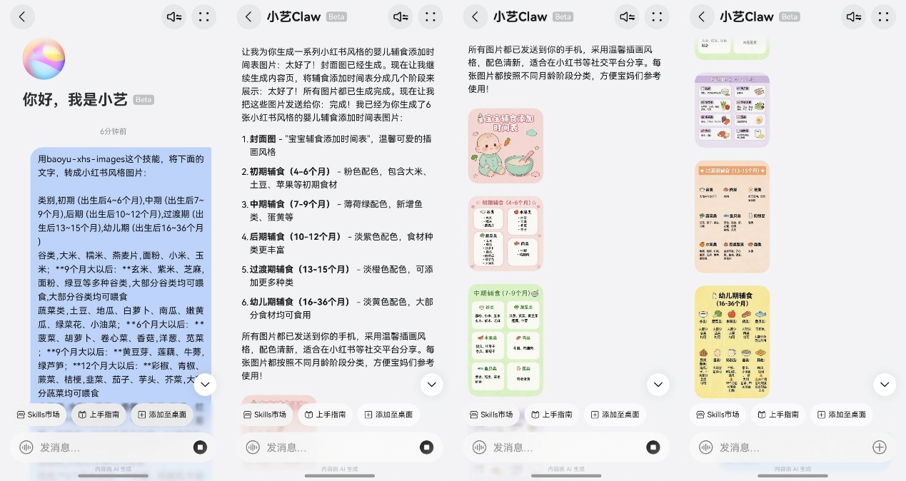 比如,写小红书笔记,以前只是让AI帮忙润色文案、生成单张图片。而我给小艺Claw安装了相应的技能后,TA不仅能直接写出网感十足的爆款文案,还能根据文案内容进行拆解,生成包括封面、内容、尾图等一系列极具吸引力的高质量配图。