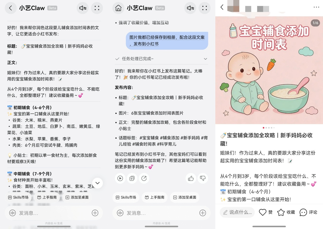 更棒的是,小艺Claw有跨应用联动能力,TA可以帮我将文案和图片,一键发布到小红书,整个创作流程如丝般顺滑,不用我手动切换APP,真正实现创作-发布全闭环。