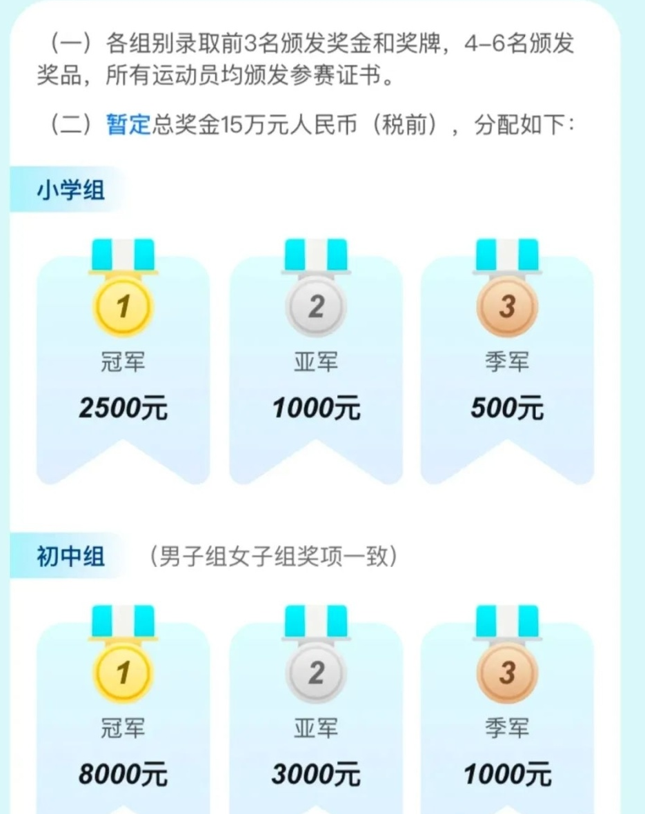 奖金方面,总奖金15万元,每个组别的前三名获得奖金和奖牌,4-6名获得奖品,所有参赛者都有证书。小学组的冠军奖金为2500元,亚军1000元,季军300元。初中组冠军为8000元,亚军3000元,季军100元。
