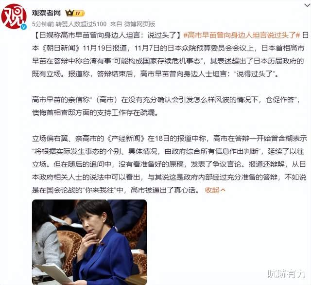 观察者网【日媒称高市早苗曾向身边人坦言:说过头了】