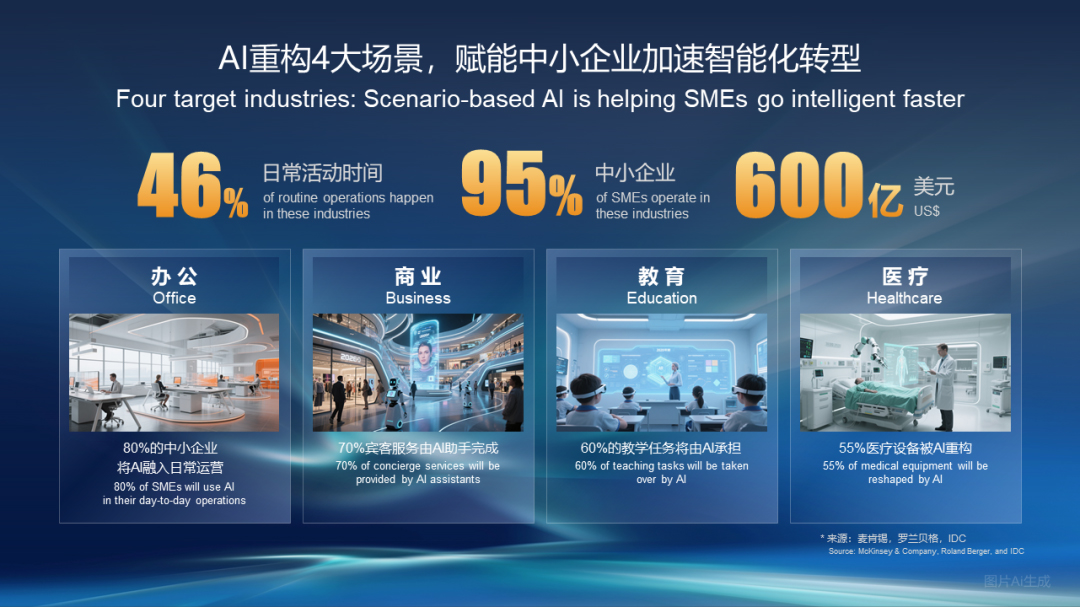 无疑,AI正在从企业的辅助工具,逐步深入到企业的核心生产系统,逐步重构了企业的产品服务模式、商业模式、工作模式。然而,和一些资金充裕、前瞻认知的大行业相比,到底有多少中小企业成功应用了AI,成功进行了智能化转型,才是全社会发展升级的关键所在。