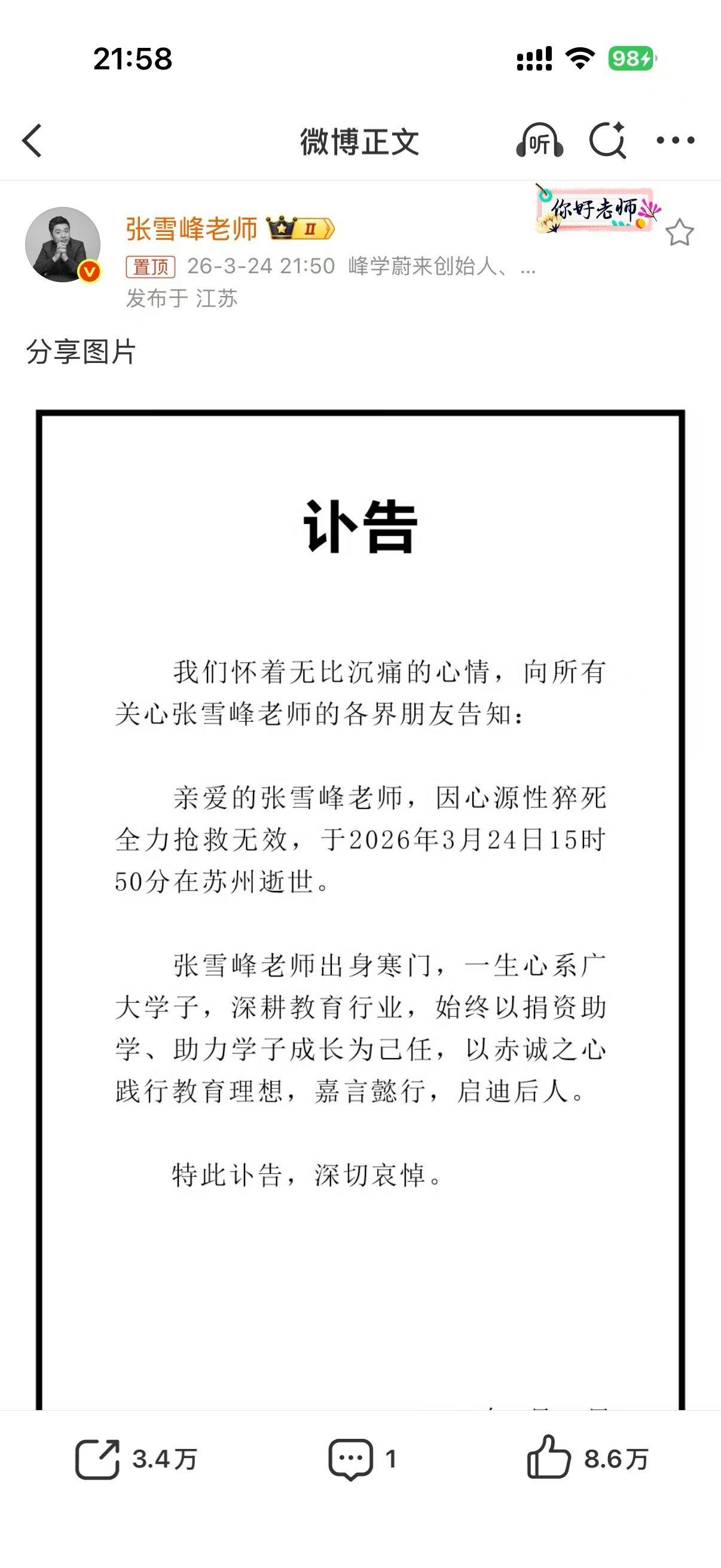 3月24号,考研名师张雪峰,在苏州突然不适,经全力抢救无效,永远离开了我们,年仅42岁。这条消息,是他本人创办的公司发的官方讣告,央视、新华社这些权威媒体也都第一时间确认了,很遗憾的告诉我们,这是真的。