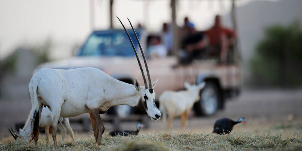 在萨巴尼亚岛上开车是允许的,不过速度必须控制在五十码以内,一旦被查到,那就是被抓包的下场,很少有人敢在阿布扎比逗留。跑得太快的动物很多,万一弄坏了一些动物,那可都是一万迪纳尔的损失。这辆马车穿过一扇沉重的大门,再加上沿途所见的各种各样的生物,简直使人相信,萨巴尼亚岛就是一座神话中的侏罗纪公园。