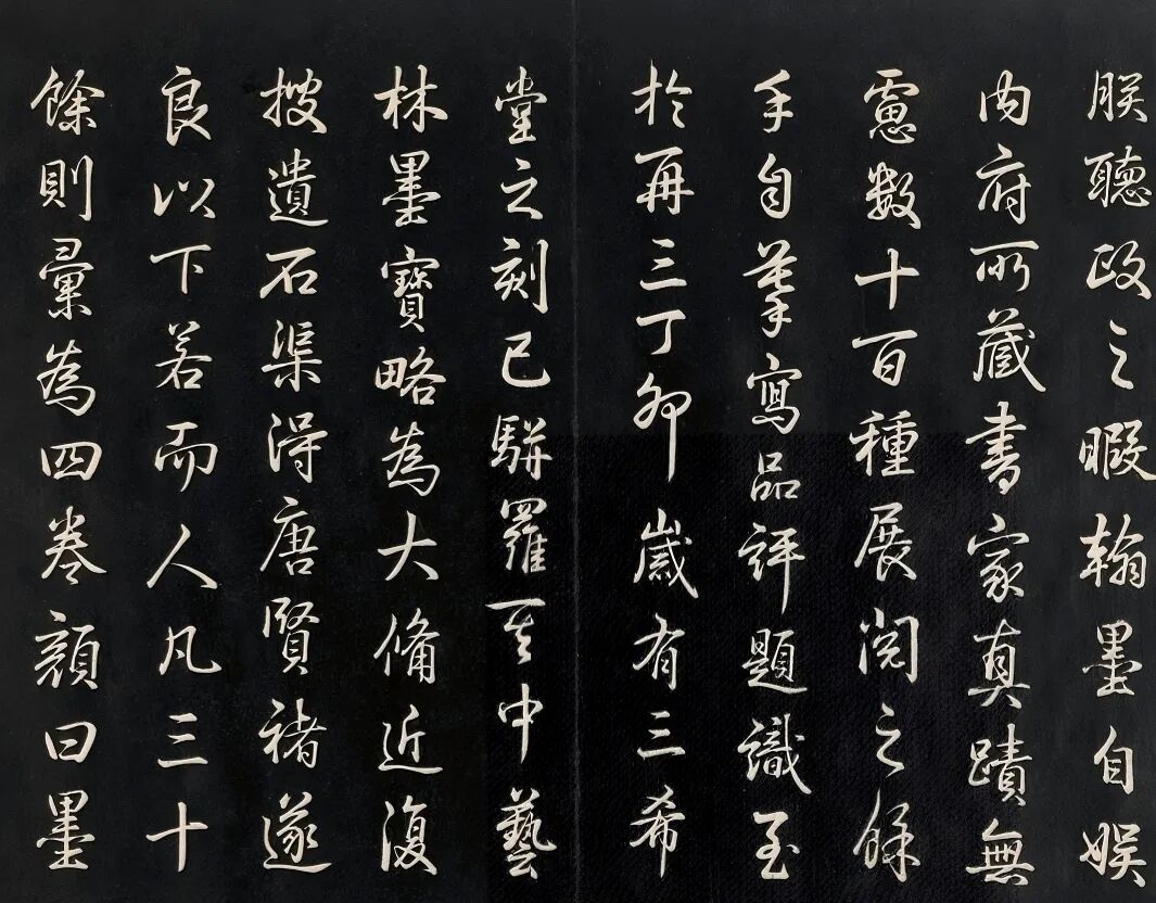 乾隆十九年(1754),乾隆敕命汪由敦、蒋溥等人将《石渠宝笈》辑录唐褚遂良以下16人所作法帖37种编次成帙,题曰《御刻墨妙轩法帖》,亦称《续三希堂法帖》:“古泽发于行间,新香流于字里,不独使前人遗墨,矩度长昭,亦以畀后学临池,津梁可逮,以是为《三希》之续。”[21]《御刻墨妙轩法帖》补《三希堂》之未备,存续前代书学法度,规范后学书艺津梁,使御刻法帖体系向典藏续编拓展,完善了书史链条的建构。