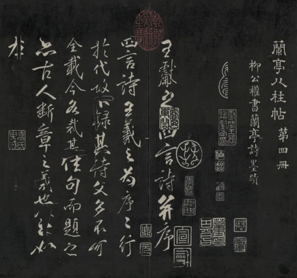 乾隆四十四年(1779),乾隆命词臣编刻《御刻兰亭八柱帖》,并于次年摹勒上石,分为8册,首刻乾隆题八柱册并序,每册首题隶书帖名及次第,第一至第三册为将内府所藏唐虞世南、褚遂良、冯承素勾摹的王羲之《兰亭序》墨迹,第四册为柳公权《兰亭诗》,第五册为《戏鸿堂帖》刻柳公权《兰亭诗》原本,第六册为于敏中补《戏鸿堂帖》刻柳公权《兰亭诗》阙文,第七册为董其昌仿柳公权《兰亭诗》,末册为乾隆临董其昌仿柳公权《兰亭诗》。《御刻兰亭八柱帖》将乾隆个人临帖与历代经典并置,既标举王羲之的书圣地位,更完成自我在书统谱系中的“今圣”定位。