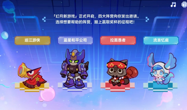 与二相乐园的幻月游戏相似,在网上开启的幻月新游戏让玩家们可以从巡江游侠、蓝星和平公司、拉面愚者和流言忆庭这四大阵营选择任一阵营加入,完成任务积攒愿力,完成后续的比赛争夺奖杯!