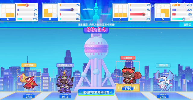 规则很简单,在阵营的直播间发送ABCD,最终阵营选择最多的方块就可以铺在吉祥物的脚下。但如果有两个阵营选择同一个方块,就会触发“撞车”两边都不能获得方块: